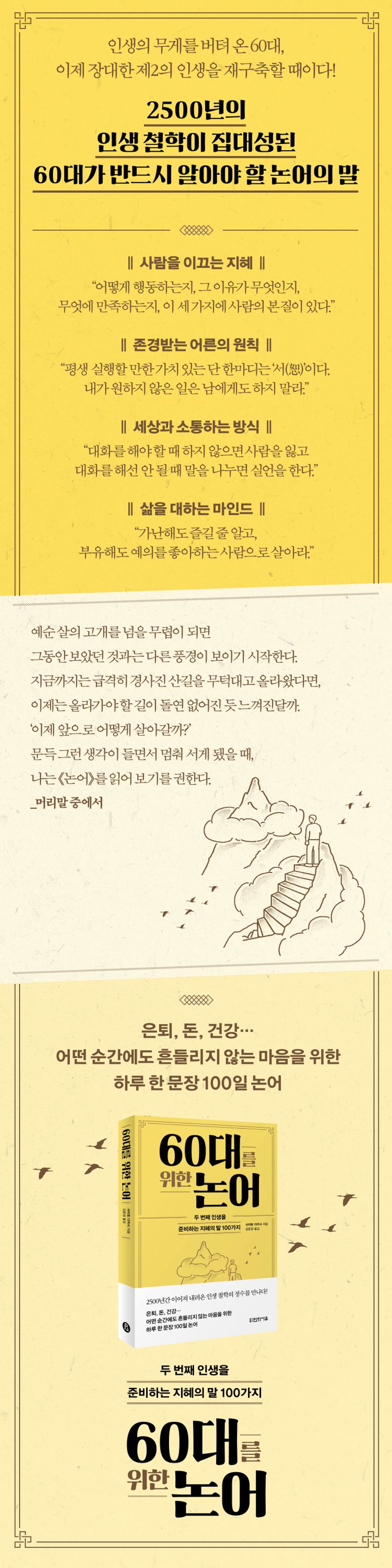 ‘이제 앞으로 어떻게 살아갈까?’ 문득 그런 생각이 든다면, 2500년의 인생 철학이 담긴 《논어》를 만나 보자. 처음 《논어》를 접하는 사람들도 부담 없이 읽을 수 있도록 일본 최고의 베스트셀러 저자가 60대에 알아두면 좋을 100가지 구절을 선별해 하루에 하나씩 읽기 좋게 구성했다. 공자의 말을 통해 지금까지의 인생을 뒤돌아보면 마음속 불안을 뛰어넘어 보다 풍성한 인생을 만드는 새로운 여정이 보일 것이다.