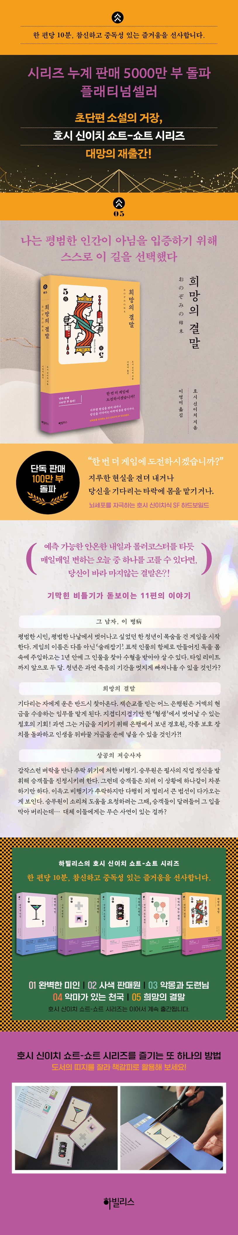 『희망의 결말』은 〈호시 신이치 쇼트-쇼트 시리즈〉의 다섯 번째 책으로, 뇌세포를 자극하는 호시 신이치의 SF 하드보일드 모음집이다. 지루한 현실을 견뎌 내기보다, 우리 앞에 기다리는 타락에 기꺼이 몸을 맡기기로 선택한 자들의 갸륵한 여정이 펼쳐진다.