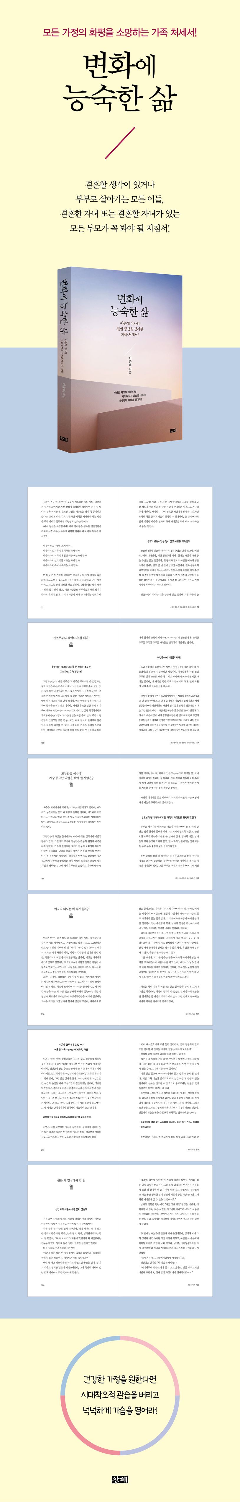 우리 사회는 과도기 중심을 달리고 있다. 가장(家長) 중심 가정경제에서 맞벌이로, 남성 위주 사회구조에서 남녀평등으로, 심지어 결혼을 필수로 여겨온 관습마저 깨어지고 있다. 이렇듯 변화기에 들어서면 수직적, 수평적 갈등이 혼란을 초래하게 되는데 《변화에 능숙한 삶》은 시대착오적 관습을 버리고 넉넉하게 현실을 받아들이자는 내용이다. 본격화된 여성의 사회진출로 그들 지위가 향상되고, 맞벌이가 대세를 이루는 현실에서 전통만을 고집하면 갈등의 골 또한 깊어지기 때문이다.