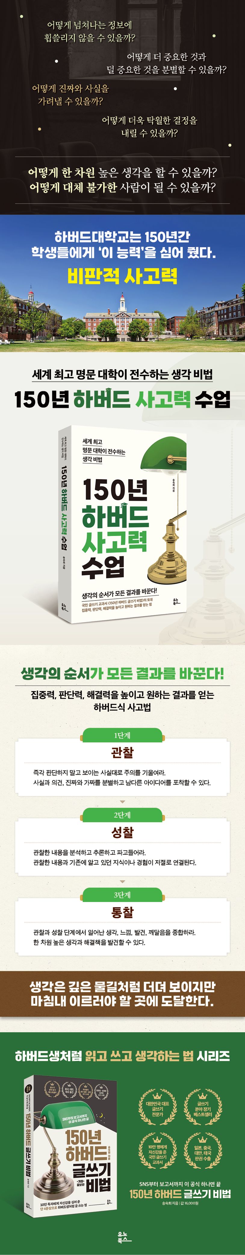《150년 하버드 사고력 수업》은 세계 최고 명문 하버드대학교가 이 시대 핵심 역량으로 가리키며 연구하고 학생들에게 트레이닝하는 비판적 사고력 루틴을 공식으로 정리한 책이다. ‘관찰, 성찰, 통찰’ 3단계로 구성된 하버드식 사고법 ‘3찰 포맷 사고법’은 하버드생이 4년 내내 배우는 비판적 사고 루틴과 생각을 논리적으로 정리하고 탁월하게 표현하는 방법을 더한 생각 도구다.