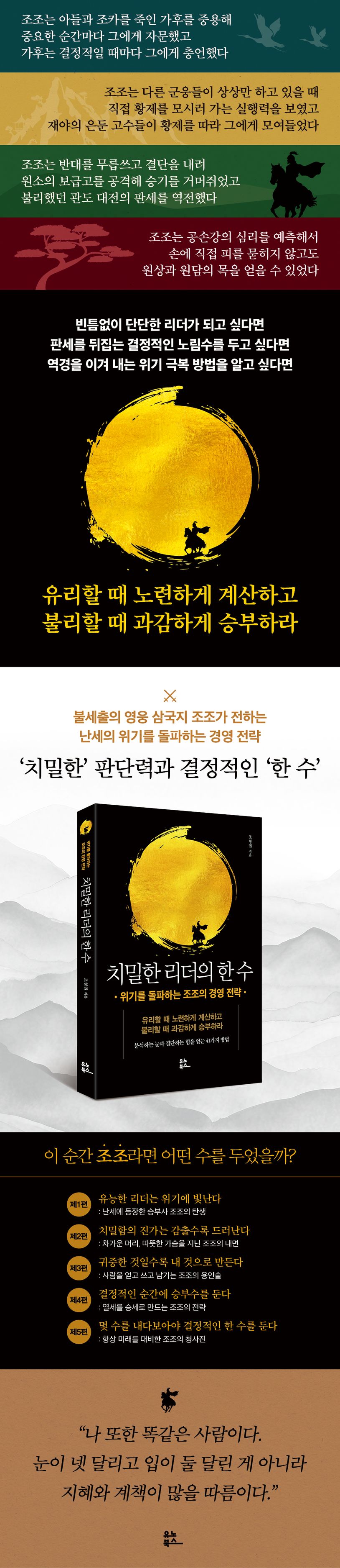 《치밀한 리더의 한 수》는 리더로서 성장하고 싶고, 조직을 올바른 방향으로 이끌고 싶은 리더들에게 조조의 지혜와 현시대에 적용할 수 있는 경영 전략을 소개한다. 사람들은 조조를 ‘치세의 능신, 난세의 간웅’으로 알고 있지만, 조조는 삼국 시대에 가장 많은 인재를 품고 가장 넓은 영토를 이룩한 전략가였다. 그는 수많은 위기를 극복하고 결국 삼국 통일의 기틀을 마련했다.