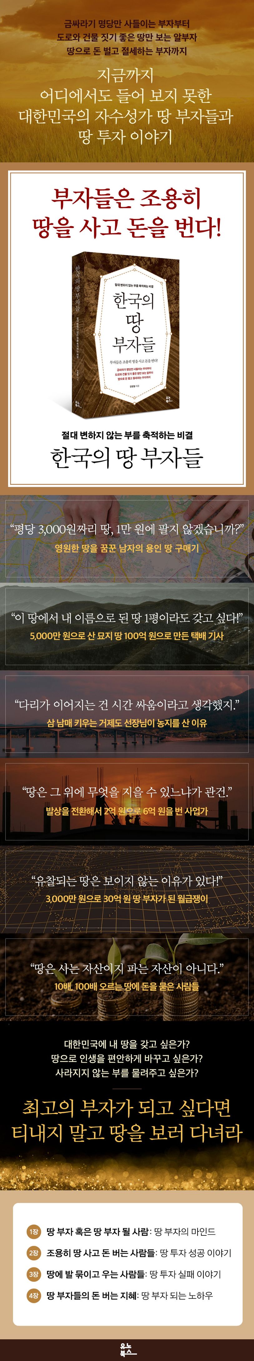 책속에서이책에는대한민국어디에나있는땅으로부자가되기위해땅을나누고쪼개고깎고메우고건물을세워서5억원,10억원,100억원돈을번사람들의이야기가있다.그런가하면땅부자를꿈꾸며투자했지만안타깝게도땅을잘못봐서잘못알아서잘못사서발이묶여처절한눈물을흘린사람들의이야기도있다.대한민국에서진짜부자는땅이있다며,땅부자가되기위해1,000만원으로땅투자를시작하는서민들의이야기가있다.그리고땅부자가되기위해준비해야하는기본적인방법과절차도담았다.이런성공사례와실패사례를통해토지투자를꿈꾸고준비하는사람들이자신감과희망을가졌으면좋겠다.사람들은토지투자가어려운걸알면서도땅에대해궁금해한다.그이유는뭘까?그것은작은돈으로큰돈을벌수있기때문이다.평범한사람이부자의꿈을꿀수있기때문이다.-6쪽‘그들은어떻게땅부자가됐나?성공과실패의생생한사례’에서땅덩어리가좁은대한민국에서개발이가능한제한된면적의땅의가치는시간이지날수록상승할수밖에없다는건누구나예측할수있다.부자들이땅을좋아하는이유는좀더확실하다.땅은더이상생산되지않아서수요는있지만공급이없는상품이기때문이다.이것은마치골동품이나명화처럼더이상생산되지않고수요만존재하는것과비슷하다.특히도심내요지에있어환금성이있는땅은시간이지날수록그가치가오를뿐만아니라지키기에도좋은재산이된다.-23쪽‘왜한국에서는땅부자가진짜부자인가?’에서많은일반인이‘장기간돈이묶이고내가팔고싶을때못팔수있다’는부정적인시각으로땅을본다.반대로땅부자는‘땅을사서부자가될수있다’는긍정적인시각으로땅을본다.땅을사서부자가된사람들은땅은한정돼있는자산이기때문에값이올라간다고확신했다.그래서장기적인안목을갖고여유자금으로땅을샀다.당장써야할생활비를줄이지않고매달남는여유자금을저축으로모아일정금액이되면땅을샀다.그사람들은늘땅에관심을갖고찾는다.그리고꾸준히땅을늘린다는생각으로사모으는것이다.-74쪽‘왜부자들은불황에도돈을버는가?’에서땅투자에서타이밍은정말중요하다.아무리좋은땅도비싸게주고사면안좋은땅이된다.나에게수익을줄수없는땅은결코좋은땅이아니다.우리나라대표우량주인삼성전자가반도체위기에5만원대로떨어졌다.대한민국국민누구나삼성전자주식이좋다는걸알지만고점에산사람은5만원으로떨어진상황에서삼성전자주식이좋은주식일리없다.마찬가지로아무리개발호재가많고좋은위치의땅도고점에서사면애물단지일수밖에없다.그래서투자에서는타이밍이아주중요하다.-121쪽‘기발한방법으로투자한두사람의결과’에서땅을사서건물로되파는토지개발의관점을여러분이이해한다면땅투자로더많은수익을만드는기회를얻을지모른다.토지개발의관점에서땅은장기투자의대상이아닌단기투자의대상이다.많은사람이땅은너무오랫동안투자해야해서꺼린다.한번사면10년이상투자해야하는줄아는데절반은맞고절반은틀린생각이다.땅은최소10년은지나야제대로수익을보는건맞지만,그건땅을사서땅으로팔때이야기고땅을사서개발후건물로팔때는이야기가달라진다.-134쪽‘발상을전환해서2억원으로6억원을번사업가’에서택지보다더수익성이좋은땅이바로‘주차장용지’다.예전에는주차장용도로밖에사용되지않았는데요즘은건폐율과용적률범위내에서부속용도로일정면적의상가를건축할수있다.그래서부동산고수사이에서주차장용지는‘황금알을낳는거위’로통한다.-187쪽‘10억원대신손해만안겨준황금알을낳는거위’에서여러분이지나가다‘저산참울창하네’라고생각이든다면그산은개발이힘들다고생각하면쉽다.다만요즘은규제가완화되는추세라제한적범위에서이런산에숲속캠핑장등의행위가가능할수있으니활용방법은전문가와상의하는게좋다.-203쪽‘내산에서내나무베는데무슨문제가?’에서땅은모든부동산의근간이고기초이기때문에땅을공부하면아파트,상가등다른부동산을이해하는데큰도움이된다.-240쪽‘그땅이돈이될지안될지어떻게판단하는가?’에서땅은실체는있지만필수재가아닌선택재로시세파악이쉽지않다.또한아파트처럼시세보다싸게내놓아도팔리지않을수있다.땅을잘못산경우는반값에내놔도팔리지않는다.이런점때문에일반사람들은땅투자가어렵다고생각하고두려움을갖고있다.하지만반대로생각하면이런특징때문에오히려땅투자로돈을벌확률은더높다.그만큼어렵고투자에두려움이있어서아무나진입할수없기때문이다.즉경쟁자가적은만큼경쟁률이낮아서먼저진입한소수의사람들만토지시장을선점하고수익을볼수있다.-253쪽‘어떤땅을사야돈을버는가?’에서