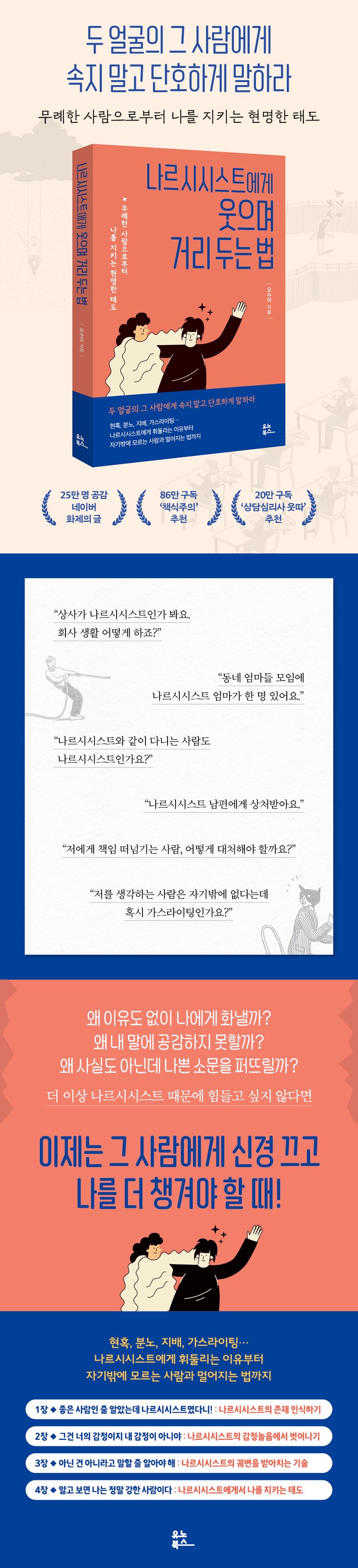 이 책은 무례한 사람들 때문에 인간관계가 고민인 사람, 나르시시스트에게 벗어나고 싶은 사람, 나르시시스트에게 상처받은 마음을 회복하고 싶은 사람을 위한 책이다. 인간관계가 힘든 이유를 자신의 탓으로 돌리며 자책하고 있다면 《나르시시스트에게 웃으며 거리 두는 법》이 도와줄 것이다. 나르시시스트에게 웃으며 거리 두는 방법을 알아보자.