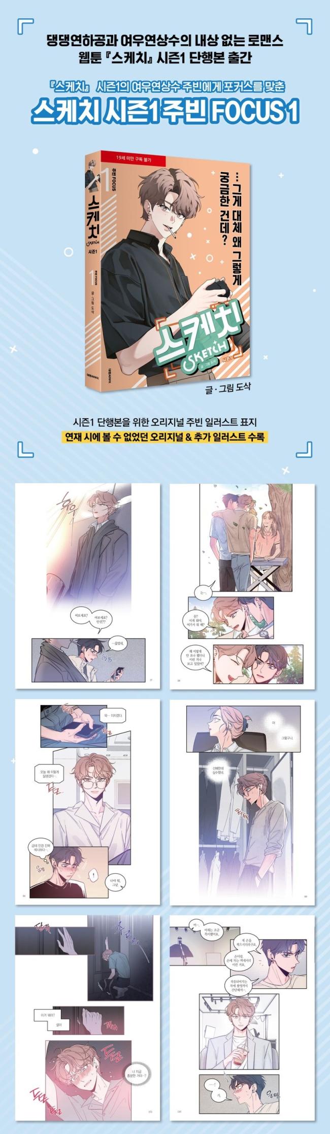 상처가생기면아물고,아물면다시다치기를반복하면서나는무언가를기대하는것같았다탁자밑으로유리컵을밀면컵이깨지는걸알고있으면서위태롭게컵을밀어놓고,깨진컵을눈앞에두고후회하다가기어코파편에손을베이는,그것이주빈의관계방식이었다.그렇게상처가생겼다아물고,아물면다시다치기를반복하면서도,주빈은무언가를기대하고있는것만같았다.겨을에우연히만났던이경의잘생긴얼굴을주빈은바로다시기억해냈다.손이많이가는우물쭈물거리는태도,얼굴에감정이바로드러나는순진한표정,아르바이트모델일을하러온이경과세번째우연으로만났을때,주빈은동료에게내뱉는다.“이경씨그냥나줘.”이경이라는바다에미끄러져들어가며주빈은처음으로물속같은고요함을느끼게된다.캐릭터의마음까지담은단행본표지오리지널일러스트『스케치시즌1주빈FOCUS1』의표지일러스트는『스케치시즌1이경FOCUS1』의일러스트에담긴이경의성격과상반되는주빈의첫인상,즉외향적인성격이드러나도록그려졌다.부드러운미소와입에문담배,캐주얼한셔츠차림은이작품의팬이라면가장먼저떠올릴법한주빈스러운이미지다.정면이아니라옆을바라보는포즈에도주빈의성격이담겨있는데,『스케치시즌1이경FOCUS1』표지의이경은감정이고스란히드러나는표정으로주빈을정면으로응시하고있지만,주빈은그런이경과눈을마주치지않는다.속마음이드러나는것에대한두려움과아직서로를알지못해남아있는거리감이표현된것이다.뒤표지에도캐릭터의감정이실려있다.뒤표지에는이경의우물쭈물거리는손에포커스를두고있다.이손은주빈의시선에서본이경의모습이다.이경의진심을똑바로마주보는것이두려워정면으로바라보지못한채시선을떨군주빈의속마음이은근히드러나있다.