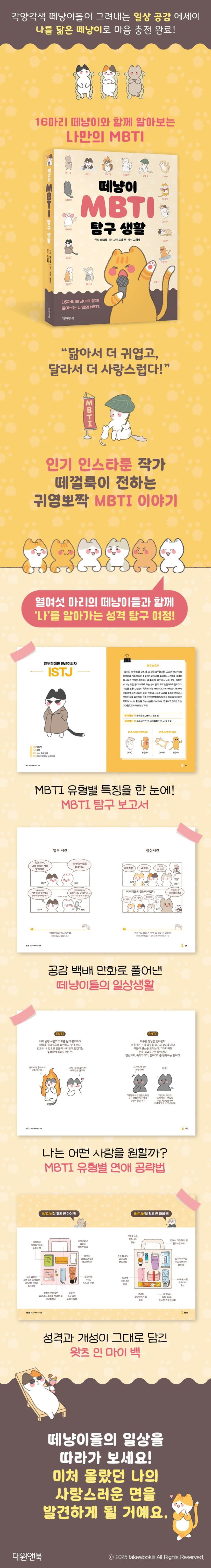 《떼냥이 MBTI 탐구 생활》은 인기 인스타툰 ‘떼냥이툰’의 사랑스러운 고양이 캐릭터들과 함께 내 안의 새로운 모습을 발견하고, 이해해 가는 유쾌한 마음 탐구 에세이다. 복잡한 인간관계와 반복되는 일상에서 ‘진짜 나’를 찾고 싶은 이들에게, 이 책은 유쾌한 웃음과 따뜻한 공감으로 일상에 작은 쉼표를 건넨다. 서로 다른 MBTI 유형을 가진 16마리의 떼냥이들의 일상을 따라가다 보면 어느새 나와 닮은 떼냥이를 발견하고, 미처 몰랐던 나의 사랑스러운 면을 발견하게 될 것이다.