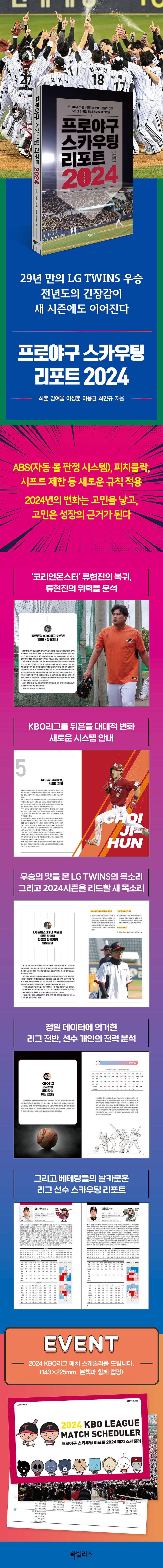 LG트윈스의 우승, 티빙에서의 프로야구 중계 등 다양한 이슈로 올드팬의 관심이 다시 야구로 돌아오는 가운데, 2024시즌에 발행된 이번 책에도 바로 지금 야구팬들에게 주목하는 새로운 기록과 인터뷰, 세밀한 스카우팅 리포트를 담았다.