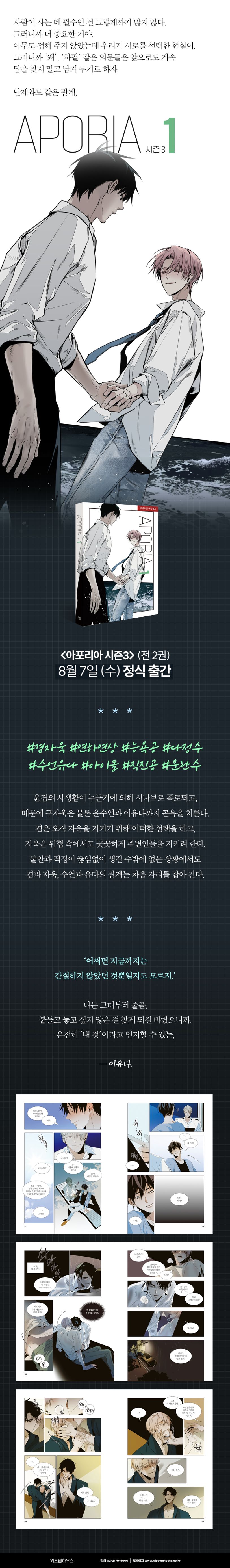 선태 작가의 『아포리아』는 북큐브에서 첫 연재를 시작해 인기리에 완결한 웹툰으로, ‘SM 플레이’와 ‘DS 파트너’라는 소재를 중심으로 많은 독자의 사랑을 받았다. 자극적이고 섹시한 작화와 분위기, 잔잔하고 서정적인 심리 묘사가 완벽하게 어우러진 작품으로, 시즌3은 갑작스레 터진 스캔들로 위기를 맞이하지만, 그를 수습하고 해결하는 과정에서 오히려 연인과 함께하는 나날이 더욱 굳건해지는 이야기를 담고 있다. 시즌3의 1권 단행본에는 연재 기준 75~91화 분량의 원고와 신년 특집 외전을 수록하였다.