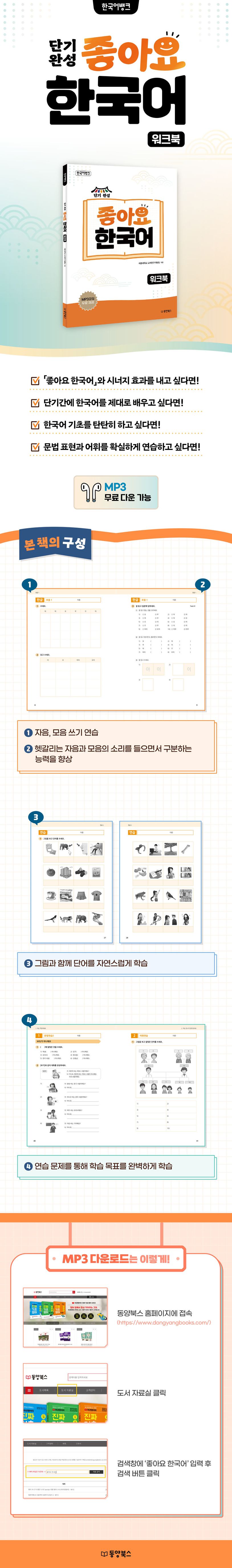 『좋아요 한국어』 [워크북]은 『좋아요 한국어』 교재와 함께 사용하면 한국어 학습의 효과를 극대화합니다. 『좋아요 한국어』 [워크북]은 학습자들이 한국어를 더욱더 심도 있게 이해하고 능숙하게 사용할 수 있도록 다양한 연습 문제를 수록하였습니다. 연습 문제를 통하여 각 과에서 제시한 어휘와 문법을 복습하여 이를 완벽하게 익힐 수 있도록 설계되어 있습니다.