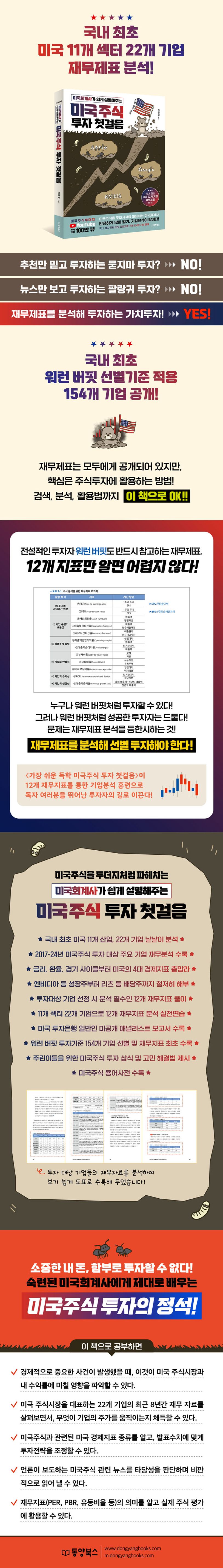 전설적인 투자자 워런 버핏이 경영하는 버크셔 해서웨이의 사업모델을 살펴보고, 워런 버핏의 투자 기준을 적용해 선별한 기업 154곳의 기업 분석 리스트를 제공한다. 이 154개 기업 중 원하는 섹터에 있는 기업을 골라 분석을 시작해 보는 것이 미국주식 투자에 있어 좋은 출발점이 될 수 있다.