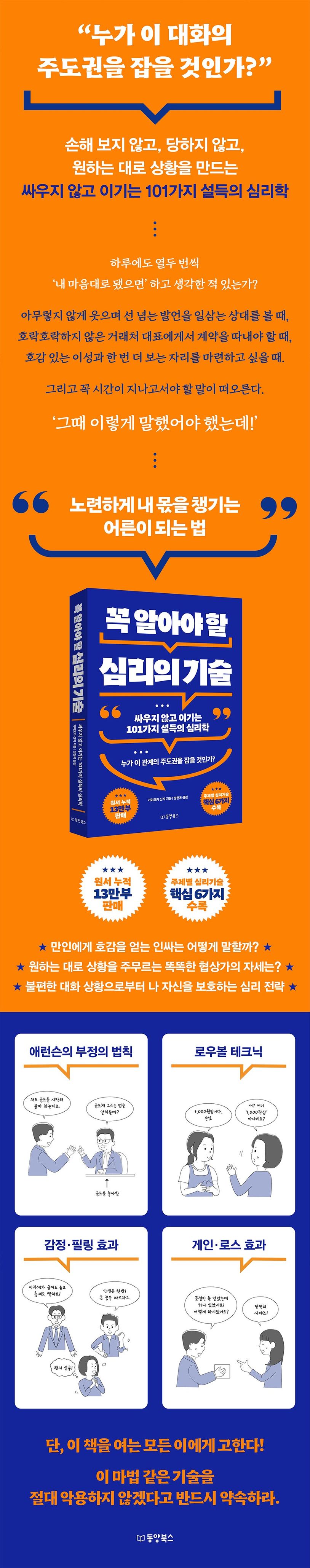 하루에도 열두 번씩 ‘내 마음대로 됐으면’ 하고 생각한 적 있는가? 아무렇지 않게 웃으며 선 넘는 발언을 일삼는 상대를 볼 때, 호락호락하지 않은 거래처 대표에게 계약을 따내야 할 때, 호감 있는 이성과 한 번 더 보는 자리를 마련하고 싶을 때. 그리고 꼭 시간이 지나고서야 할 말이 떠오른다. ‘그때 이렇게 말했어야 했는데!’ 하지만 이제부턴 기회를 놓칠 일도 없고, 속절없이 당할 걱정을 하지 않아도 된다. 비즈니스 심리 연구의 일인자, 신간 《꼭 알아야 할 심리의 기술》의 저자가 최신 심리학 이론을 바탕으로 ‘꼭 알아야 할 심리의 기술’ 101가지를 알려주기 때문이다. 이 놀라운 기술은 중요한 순간에 싸우지 않고 이기는 쪽으로 당신을 이끌어줄 것이다. 오히려 당신이 손을 뻗는 모든 일이 전부 다 원하는 대로 거침없이 진행되어 당황할 수도 있음을 미리 경고한다!