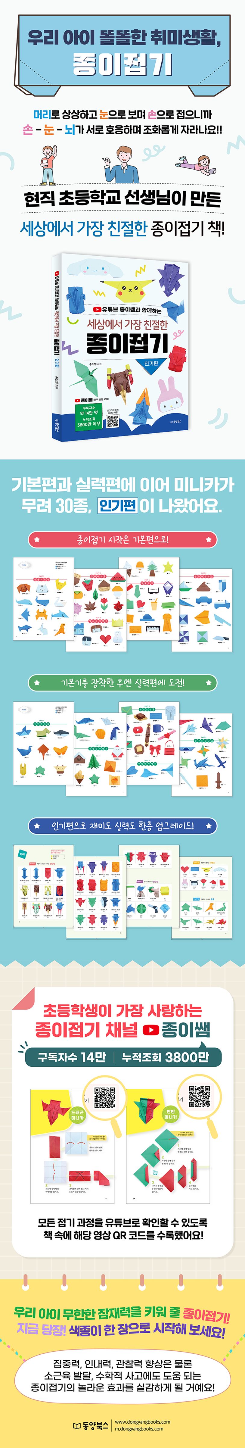 이 책은 현직 초등학교 교사이자 초등학생들이 가장 사랑하는 종이접기 유튜버인 종이쌤이 아이들과 종이접기 활동을 하며 경험한 것들을 바탕으로 아이들의 정서적, 지능적 성장에 도움을 주고자 엄선한 다양한 작품들을 수록했다.