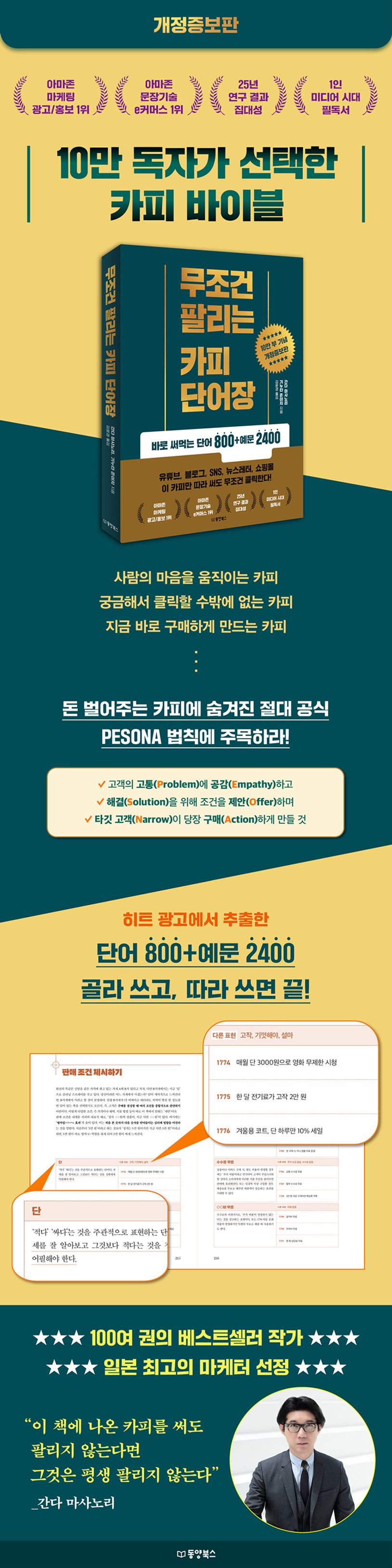 약 100권의 책을 집필한 베스트셀러 작가이자 일본 최고의 마케터로 꼽히는 간다 마사노리. 그의 대표작 중 하나이며, 한국과 일본 양국에서 카피 바이블로 사랑받아온 『무조건 팔리는 카피 단어장』이 개정증보판으로 돌아왔다. 한층 더 깊어진 경험과 연구 결과를 바탕으로, 수많은 히트 광고에서 효과가 검증된 카피 단어와 예문을 ‘대폭’ 추가했다. 이번 개정증보판에서만 특별히 제공되는 두 가지 부록은, 단어와 예문의 보물 창고에서 독자들이 더 쉽고 빠르게 아이디어를 찾을 수 있도록 이끈다.