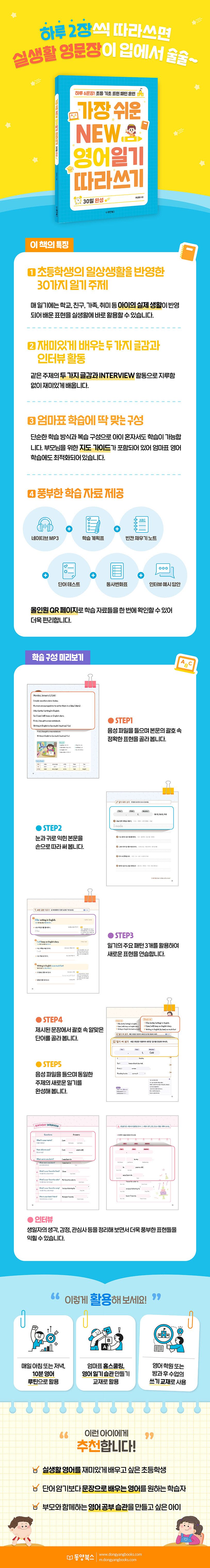 『가장 쉬운 NEW 영어일기 따라쓰기』는 초등학생이 자주 접하는 30가지 대표 일기 주제를 담아, 실생활 영어 문장을 자연스럽게 표현할 수 있도록 구성된 책입니다.