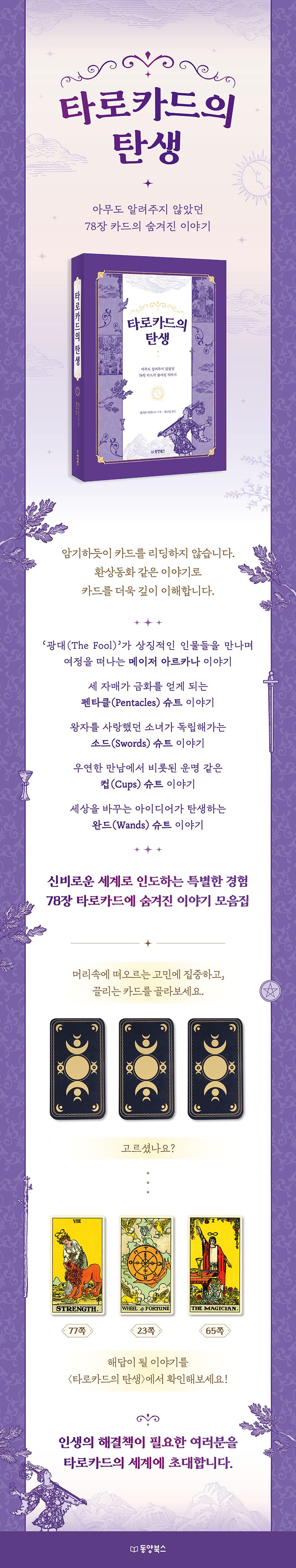 〈타로카드의 탄생: 아무도 알려주지 않았던 78장 카드의 숨겨진 이야기〉는 타로카드 78장에 숨겨진 이야기를 전해주는 특별한 스토리북입니다. 기존에 출간된 지식 전달 위주의 해설서와는 달리, 카드마다 지닌 메시지와 의미를 신비롭고 재미있는 이야기(스토리텔링)와 결합하여 독창적이고 차별화된 특징을 지니고 있습니다. 영국 노팅엄 출신의 작가이자 타로 리더인 앨리슨 데이비스의 작품으로, 이야기의 힘으로 해석과 공감을 이끌어내어 카드의 의미를 쉽게 이해하고 그 안의 지혜를 우리의 삶에 직접 적용할 수 있게 안내합니다.