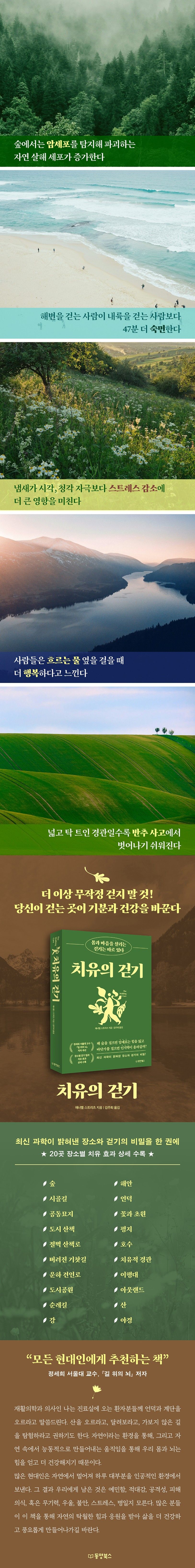 더욱 놀라운 사실은 걷는 곳에 따라 우리 몸과 마음에 미치는 영향이 달라진다는 것이다. 신간 『치유의 걷기』는 걷기와 관련된 과학적 연구 결과를 토대로, 장소별 걷기의 이점을 집대성한 책이다. 도시공원부터 평지, 언덕, 숲, 호수, 산, 강, 순례길 등 무려 20곳의 장소를 다루며, 걷기의 치유 효과를 극대화할 수 있는 실용적인 팁 역시 별도의 노트로 상세히 안내한다. 더 이상 무작정 걷지 말자. 똑똑한 걷기가 당신의 몸과 마음을 살릴 것이다.