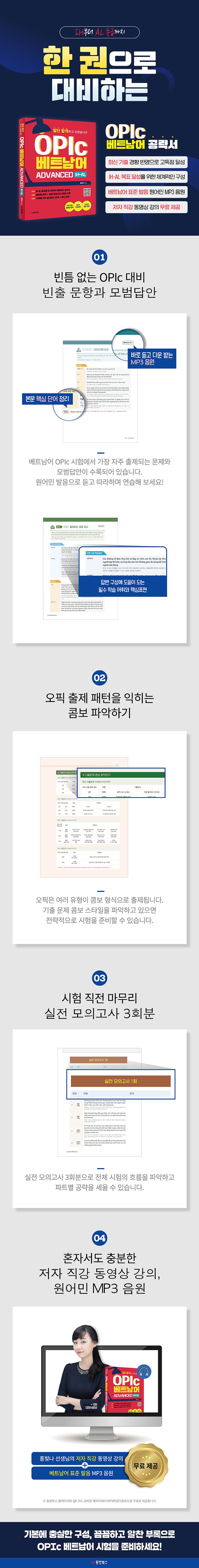 베트남어 OPIc(오픽) 시험 대비를 위한 최선의 방법을 제시한 공략서를 추천합니다. 시험에 가장 많이 출제되는 주제를 선정하여 모범답안과 함께 제시했습니다. OPIc 시험은 하나의 선택 주제가 연계되어 콤보 형식으로 출제되므로 시험 흐름을 알아두는 것이 중요합니다. 자기소개 파트부터 서베이 주제, 일반 주제, 롤플레이까지 연계되는 흐름을 파악하고 나만의 답안을 구성하여 빈틈없이 베트남어 오픽 시험을 준비할 수 있도록 구성되어 있습니다. 질문과 답변 전체 MP3 음원과 저자 직강 동영상 강의를 무료로 제공합니다.