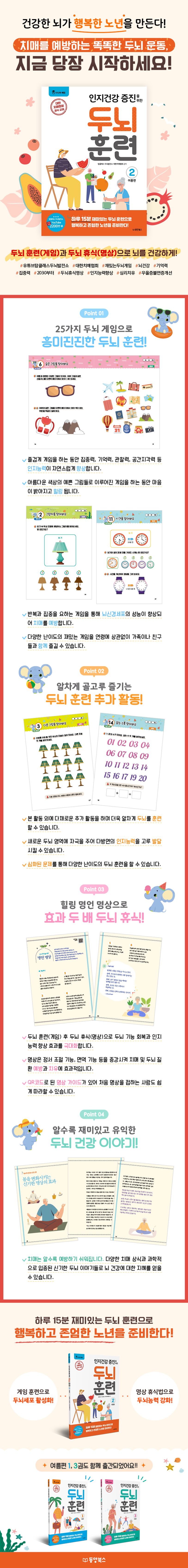 두뇌 훈련 시리즈 중 가을편 3권, 겨울편 3권, 봄편 3권에 이어 마지막 여름편 3권이 출시되었다. 총 12권으로 이루어진 〈인지건강 증진을 위한 두뇌 훈련〉은 과도한 스트레스 속에 마음이 쉬지 못하고, 뜻처럼 마음을 운용하지 못해 고통 받는 현대인들이 두뇌 건강을 지키고 행복한 삶을 이어가는 현명한 선택이 될 것이다.