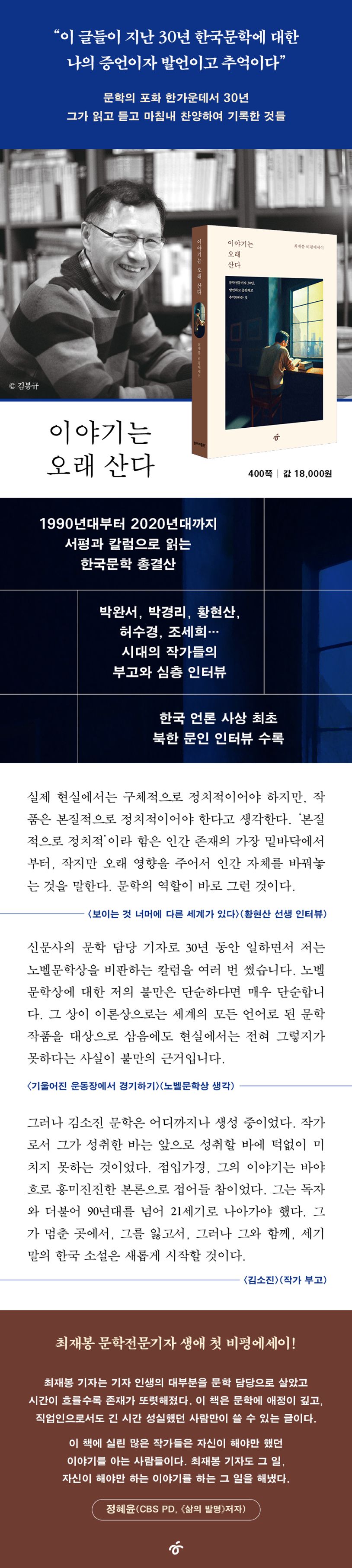 기자로서 묵묵히 그리고 켜켜이 써온 30년 동안의 글들을 엮은 《이야기는 오래 산다》에는 작가와 작품, 출판과 사회의 지형도가 선연하다. 풍부한 문학 읽기를 제공한다는 점에서는 충실한 문학 수업기이자, 문학이 호위한 세계와 문화를 촘촘히 들여다볼 수 있다는 면에서는 날카로운 시대 비평기라고 할 만하다.