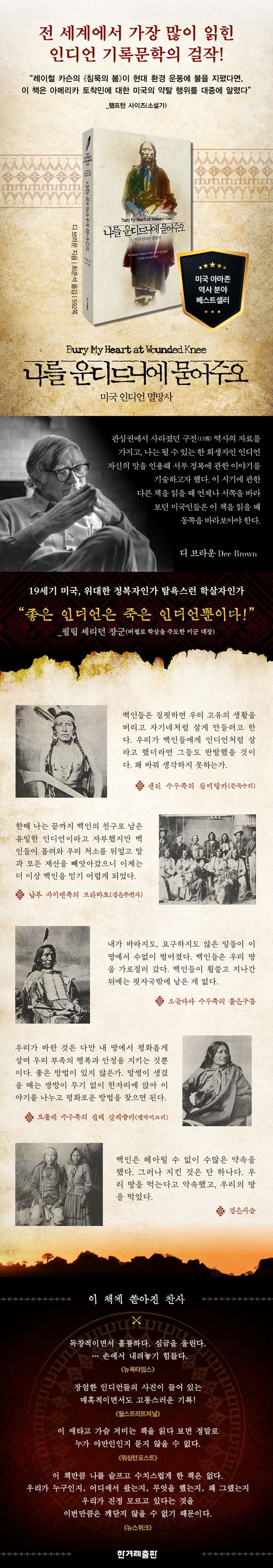 1970년 미국에서 출간된 이래 10여 개 언어로 번역되어 전 세계적으로 500만 부 이상 판매된 인디언 기록문학의 걸작 《나를 운디드니에 묻어주오》가 복간되었다. 우리나라에서는 1996년에 처음 번역되어 소개된 후 네 곳의 출판사를 거치며 거듭 출간될 만큼 많은 독자의 기대와 성원을 얻었다. 최근 국내 저작권 계약이 만료되어 기존·예비 독자들이 크게 아쉬워했고 나아가 조만간 다시 복간되기를 바라는 간절한 요청이 많았다. 이에 한겨레출판은 기존 표지에 변화를 주고 본문의 잘못된 편집을 새롭게 다듬어 복간하였다. 1860년에서 1890년대까지 서부 개척기의 미국은 황금과 마차와 총잡이의 시절이었다. 인디언들은 땅을 소유한다는 개념 자체가 없었고, 그들의 땅으로 들어온 백인들은 황금을 위해 땅을 반드시 차지해야 했다. “신은 진정 우리에게 축복을 내렸다. 황금은 여기 우리의 발치에 널려 있어 그저 주워 담기만 하면 된다”고 했던 미군 소령의 말이 당시 백인들의 신념을 대변한다. 땅을 빼앗기 위해 워싱턴의 정책 입안자들은 '명백한 운명'이라는 용어를 만들어 냈다. '명백한 운명'이란 유럽인과 그 후손들이 신대륙을 다스리도록 운명 지어져 있으며, 지배 민족으로서 당연히 인디언의 땅과 삼림과 광산을 모두 책임져야 한다는 것이다.