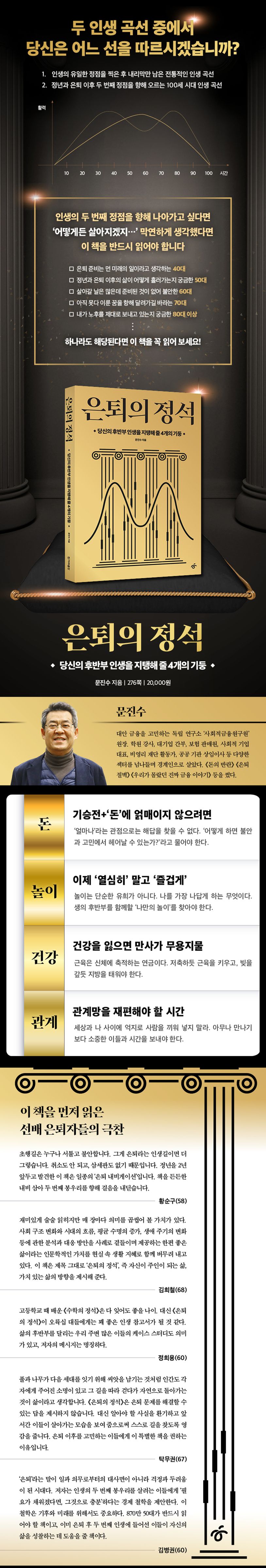 신작 《은퇴의 정석》은 좋은 삶을 위한 이 4가지 요소를 단단하게 만들 수 있는 구체적인 방법과 필수 지침을 담았다. 수명은 늘고 은퇴는 늦어지고 인생 곡선이 바뀌는 상황에서 우리는 후반부 삶에 대한 낡은 인식의 틀을 깨고 새롭게 재설정해야 한다. 이 책에 실린 선배 은퇴자들의 생생하고 진솔한 사례는 시행착오를 줄이고 보다 또렷하게 은퇴 청사진을 그리고 싶은 독자들에게 좋은 케이스 스터디가 될 것이다. 생의 반환점을 돌고 정년이 임박한 베이비붐 세대와 멀지 않은 시점에 삶의 후반부를 시작할 4050세대에게 저자는 이렇게 조언하고 있다. “천천히 가도 되지만 시동은 빨리 거는 것이 좋다.”(45쪽)