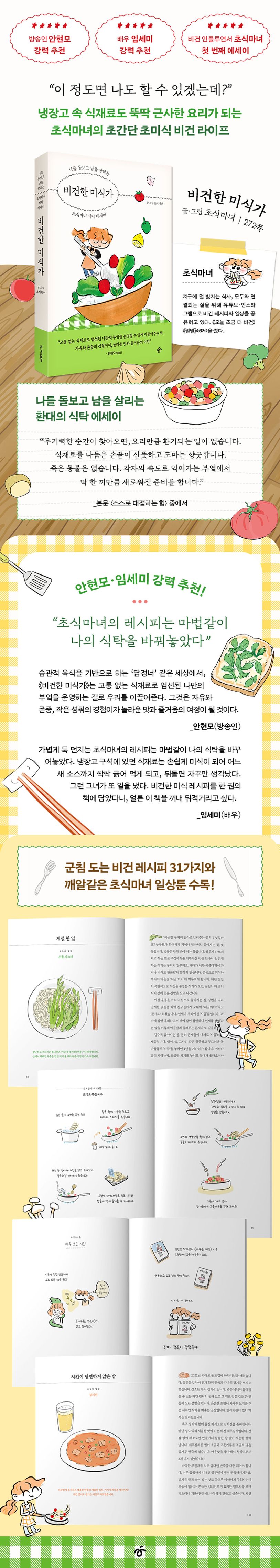 전작 《오늘 조금 더 비건》에서 비건 생활 기록을 담은 네 컷 만화로 비건에 대한 독자들의 마음속 문턱을 낮추고 각종 매스컴의 주목을 받은 비건 인플루언서 ‘초식마녀’가 첫 에세이 《비건한 미식가》를 선보인다. 이 책은 작가가 정갈한 비건 요리를 통해 스스로를 돌보고, 주변과 연결되는 이야기를 담뿍 담은 식탁 에세이이다. 여기에 배우 임세미의 말처럼 “냉장고 속 재료가 손쉽게 미식이 되는” 마성의 채식 레시피 31가지와 깨알 같은 일상 툰을 직접 그려 읽는 맛을 더했다. 비빔밥·비빔국수처럼 요리 초보도 할 수 있는 간단한 요리부터, 뜨끈한 김치 칼제비와 멋스러운 토마토 알리오 올리오, 깊은 맛을 내는 감자탕 라면과 비건 마라탕까지, 비건 음식에 대한 고정관념을 깨는 다채로운 초식마녀표 요리가 입맛을 돋운다. 직접 운영하는 유튜브 채널 과 인스타툰을 기반으로 5년간 수많은 독자들을 사로잡으며 자신만의 비건 라이프를 영위한 그의 진심이 엿보인다.