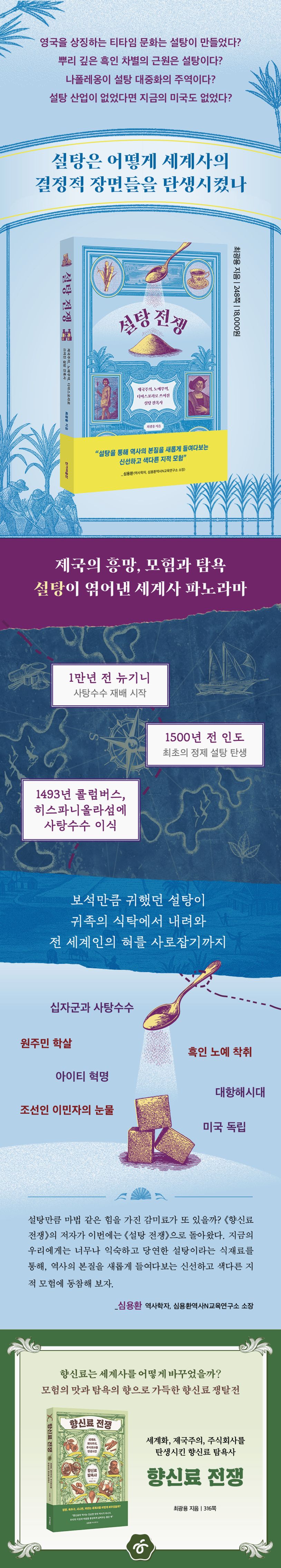 15세기후반부터시작된대항해시대에는포르투갈과스페인을필두로영국,프랑스,네덜란드등유럽열강들이앞다투어대서양을건너아메리카,아프리카,아시아로세력을확장해나갔다.크리스토퍼콜럼버스,바스쿠다가마같은역사적모험가들도비슷한시기에등장했다.이들의목숨을건항해는후대에종종낭만적인모험담으로그려지지만,실제로는단순한모험심이나영웅심만으로감행할수있는일이아니었다.당시원거리항해는국가의전폭적인지원없이는불가능했던만큼,열강이주도하고후원한대항해는신대륙정복과자원수탈이라는분명한목적을띠고있었다.《설탕전쟁》은그중심에바로설탕을향한욕망이있었음을흥미롭게풀어낸다.