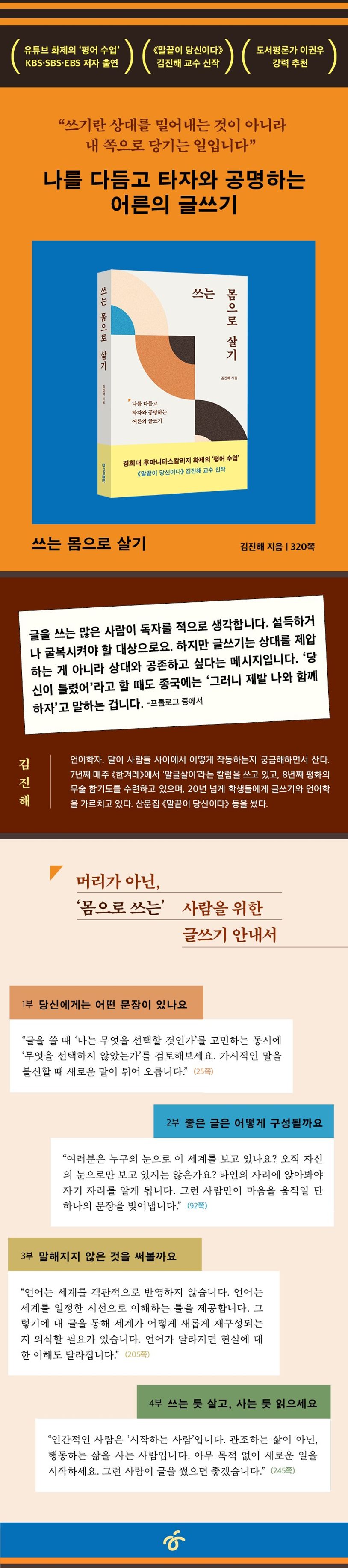 강의실에서 서로 평어를 사용하는 독특한 수업 방식으로 화제된 언어학자 김진해(경희대 후마니타스칼리지 교수)는 쓰기란 “상대를 밀어내는 게 아니라, 내 쪽으로 당기는 일”(5쪽)이라 말한다. 이번 신작 《쓰는 몸으로 살기》 역시 나를 다듬고 타자와 공명하는 ‘둘의 경험’으로서의 쓰기에 주목한다. 언어학자로서 다양한 언어의 본성을 몸의 감각으로 짚어내며 글쓰기에 대한 새로운 접근을 시도한다.