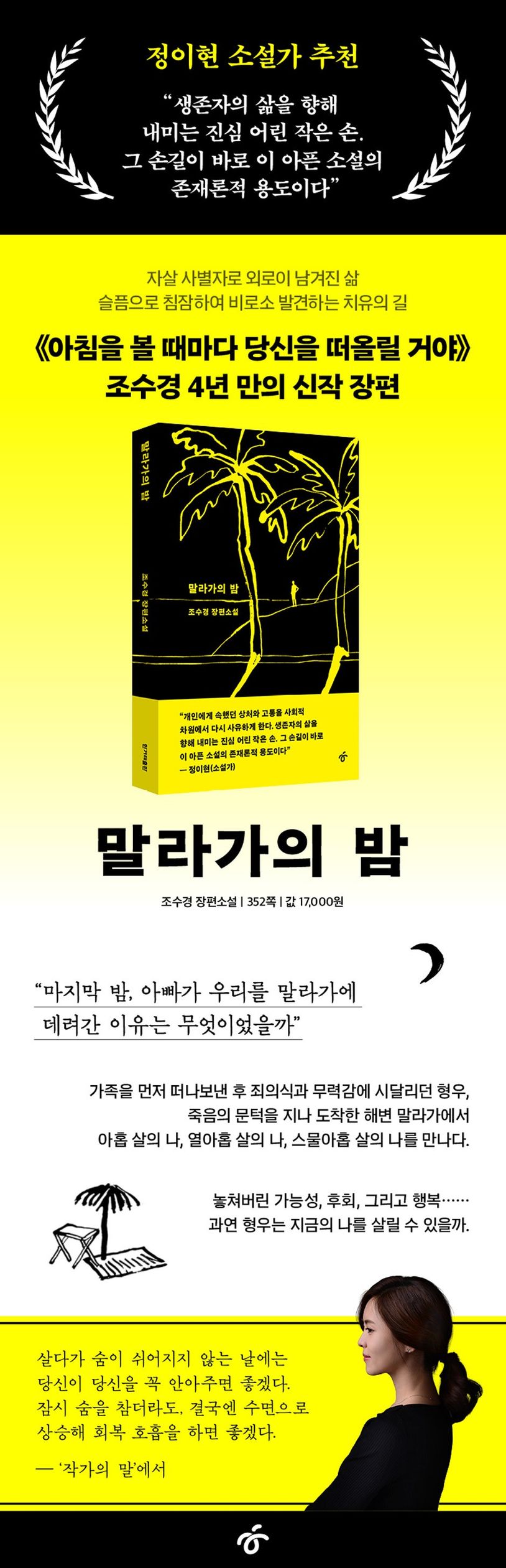 “세월을훌쩍건너뛰니선명하게보이는것들”지금의나를살릴방법을찾는이들을위한이야기생사의갈림길인해변말라가에서형우는제일먼저아홉살의형우를만난다.어린시절에살던집으로돌아가젊은나이의엄마와어린동생을조우한다.아빠의부재로생활에부침을겪었으나셋이서사랑으로충만했던시간을다시보내며가족의따스함과소중함을되새긴다.열아홉살의형우를통해서는동생이처음으로아빠의죽음에의문을드러냈던순간을돌아본다.그때동생의질문을무시하지않고사려깊게대화를나누었더라면어땠을까하는회한에젖어든다.그랬다면형제사이가소원해지지않았을지도,동생의우울이심화되지않았을지도모른다는죄의식을거듭느낀다.스물아홉살의형우는대기업에다니며눈코뜰새없이분주한나날을보내고있다.신규사업준비에치여엄마와동생의번민을도외시하는과거의모습에서형우는마음깊이자책한다.아주작은관심과배려만으로도참담한불행을막을수있었으리라는깨달음을얻기도한다.생의면면을곱씹어보는과정에서형우는그간제대로들여다보지못했던과오와놓쳐버린가능성,후회,행복의순간들을오롯이마주한다.과거의자신들을경유해잃어버렸던삶의기쁨과의욕을되찾으며조금씩새로운미래를꿈꾸기시작한다.텔레비전에서어떤과학자가그러더라고요.죽기전에살아온날들이필름처럼스쳐가는이유는,생에서체득한모든경험속에서지금의나를살릴방법을찾기위해서라고._313쪽“숨이쉬어지지않을땐함께숨을참는것도방법”물속에서길을잃지않도록서로에게손내미는사람들바다에서구조되어현실로돌아온형우는자신처럼자살사별자인프리다이버들과함께물속으로잠수하는나날을보낸다.고요하고깊은바닷속으로침잠함으로써오히려숨통이트이는듯한경험을한다.투신자살과유사해보이면서도전혀다른목적을지닌프리다이빙을통해그동안의죽음충동을극복해간다.무엇보다다른자살사별자들과교류하는과정에서형우는고립된감정상태로부터벗어나서서히마음의문을열게된다.“손내밀면서로를잡을수있는거리에서,서로를구할수있는거리에서,버디와함께수면으로올라와다시숨을들이마시는”행위를반복하며개인적인비통과괴로움이타자와의연대로치유될수있음을발견한다.우리,이유를찾으려고하지말자.결말을알수없는게살아있는이들의삶이라면,결말은알고있되그이유를알수없는게스스로떠난이들의삶이니까.결코다알수없지…….죽음의원인에서내탓을찾지도말고.죽음으로그의삶을미화하거나왜곡하지도말고.있는그대로기억하면서,그렇게,그렇게._82쪽“누군가마음을앓으면그가족도전부도움이필요해지거든”전염되는우울을딛고끝끝내새로운숨을들이켜는회복호흡한국은OECD국가중자살률1위로2024년에만1만4872명이스스로목숨을끊었다.하루평균40.7명이자살로생을마친셈이다.그에따른비애와혼란은주변의가족,친구,동료들의몫으로남는다.사랑하는이를먼저떠나보낸이들은죄의식과분노,무력감으로오랜기간비탄에빠지고심한경우자살을택하기도한다.그렇기에《말라가의밤》은자살사별자가자살생존자라고도불리게된배경과이유를고스란히보여준다.동시에그들의슬픔이지나간시절을톺아보고남겨진이들끼리서로연결됨으로써회복가능한상처임을알린다.지극한애통속에서도힘찬발짓으로수면을박차고오르는존재들을통해한줄기빛과같은위로를선사한다.작가의말살다가숨이쉬어지지않는날에는당신이당신을꼭안아주면좋겠다.구와일구와이구와삼구가서로를안아주었듯이.잠시숨을참더라도,결국엔수면으로상승해회복호흡을하면좋겠다.슬픔도,분노도,우울도힘이세다.한사람혹은그이상의생명을꺼뜨릴만큼강력한에너지를품고있다.그렇기에마음에‘우울력발전소’를세우고역으로그에너지를당신이숨쉬는데,당신만의빛을발하는데모조리써버리면좋겠다.