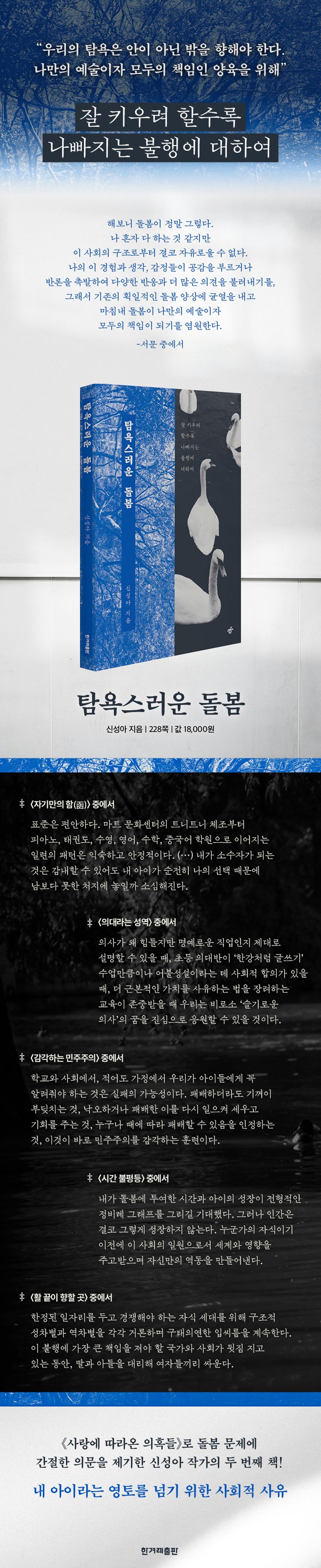 “부모이기 전에 각자의 ‘나’들이 먼저 자신을 들여다보고, 타인을 돌보는 그 마음을 돌이키기를 제안하고 싶었다. 그렇게 자신뿐 아니라 우리를, 이 사회를 함께 돌아보면 돌봄이 조금은 덜 힘들 수 있을 것이라 기대하기 때문이다. 돌봄의 어려움은 나 혼자 애쓴다고 덜어지지 않는다.” _서문 중에서