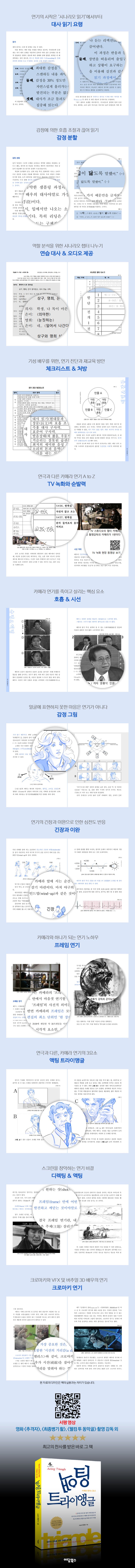 신인은 물론이며 기성 배우에 이르기까지, 독학으로 연기를 배울 수 있도록 시나리오 분석에서부터 대사 읽기와 카메라 연기의 완성까지를 단계별로 정리했다.