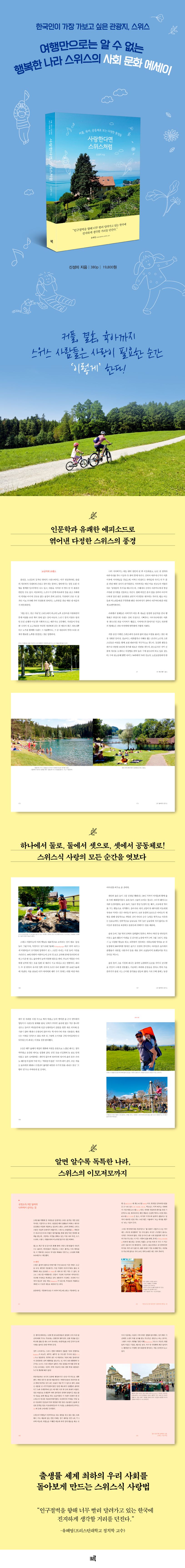 아름답게 펼쳐진 자연 풍경으로 해마다 많은 이들이 스위스에 방문한다. 하지만 자연만큼 진국인 스위스 사람 간의 일화는 결코 여행만으로 알 수 없다. 작가는 스위스인 남편을 만나 딸 레나와 함께 스위스 사회와 문화를 천천히 체감해 나가며 『사랑한다면 스위스처럼』을 썼다. 한국인의 시선으로 스위스에서 태어나 노년을 맞이하기까지의 일생과 일상을 따라가 본다면 어떨까? 관광객은 물론 스위스 자국민조차 미처 인지하지 못한 ‘엄격한 듯 따뜻한’ 매력을 발견할 수 있을 것이다. 아이에게도 악수를 건네는 정중함, 눈비가 쏟아져도 외출하는 단순함, 노년이 되어서도 데이트를 즐기는 모습 등을 보고 있자면 다정함의 정의가 어렵지만은 않게 느껴진다. 그렇게 한 명 한 명, 하루하루가 쌓여 지금의 스위스로 소개할 수 있게 된 게 아닐까. 관광지뿐이 아닌 아이부터 노인까지 행복한 나라 스위스. 경제·문화부 기자 출신 작가가 가정을 이루며 경험한 일화를 통해 ‘이런’ 사랑 방식도 가능하다는 것을 이해해 보자.