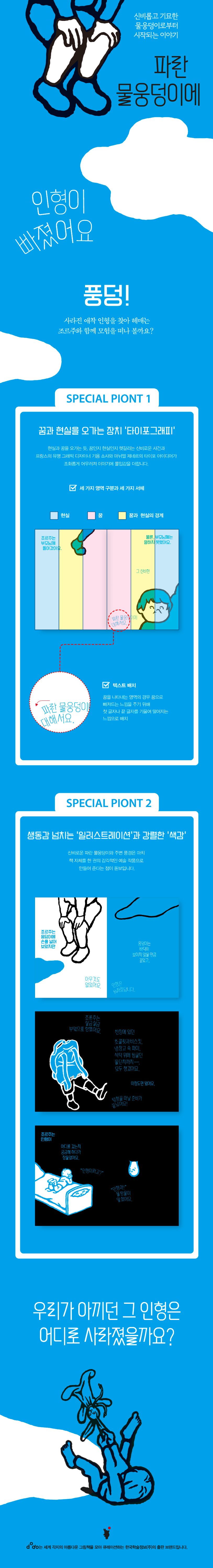 어른부터 아이까지 모든 연령층이 모여 앉아 함께 읽는 《파란 물웅덩이에 인형이 빠졌어요》가 출간되었다. 이 책은 신비롭고 마법 같은 이야기로 독자의 시선을 사로잡는다. 어느 날, 꿈과 현실의 경계에서 애착 인형을 잃어버린 조르주. 그는 부모님 몰래 살금살금 방에서 나와 식량과 생존용품을 챙겨 인형을 찾기 위한 모험을 떠난다. 이 책은 어린 시절 우리가 마음에 품고 살아왔던 모험심, 용기, 상상력, 그리고 애착 물건에 품었던 사랑을 되살아나게 만든다. 이야기 속으로 빠져들게 만드는 구성 방식 역시 특별해서 캄캄한 밤이 되면 모두 푸른 밤의 꿈속으로 빠져들 수 있게 만드는 책이다.