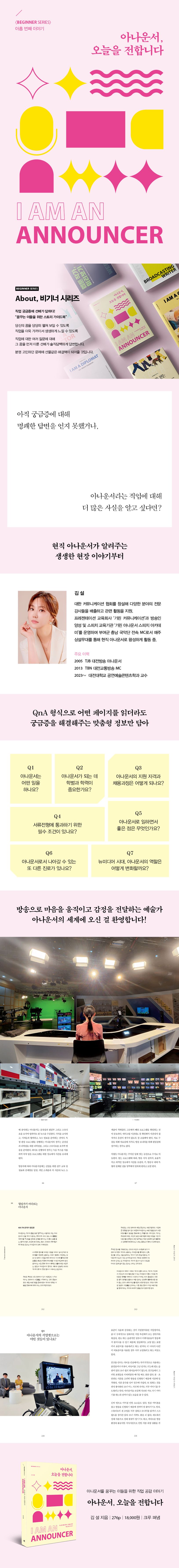 이 책은 지금 이 순간 일어나는 일들을 세상에 전하고 싶은 예비 아나운서들을 위해 쓰였다. 아나운서가 되는 방법부터 아나운서의 업무와 일상, 아나운서들의 숨은 노력과 고충까지 넓은 스펙트럼의 이야기를 한 권에 담아냈다. 이를 통해 직업 세계의 큰 틀을 이해하고 방송국 안팎에서 일어나는 모습을 엿볼 수 있다. 아나운서가 되고자 하는 이들은 물론, 방송과 관련된 일에 높은 관심을 가진 이들에게도 친절한 참고서가 될 것이다.