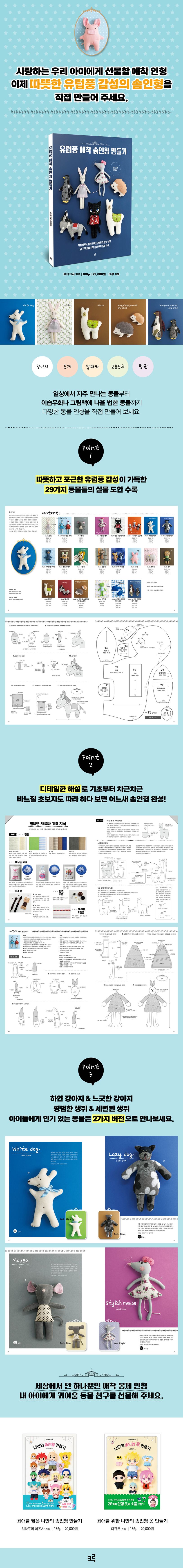 『유럼풍 애착 솜인형 만들기』는 핸드메이드 수공에 실용서를 꾸준히 출간해 온 부티크사에서 야심 차게 엮어낸 책이다. 유럽풍 감성을 담은 인형 중에서도 귀여운 동물을 다루었다. 도안을 보며 직접 인형을 만들 수 있도록 상세한 작업 과정 설명과 함께 실물 크기 도안이 수록되어 있다. 동물 인형에 이름을 붙여 다양한 용도로 사용해보자.