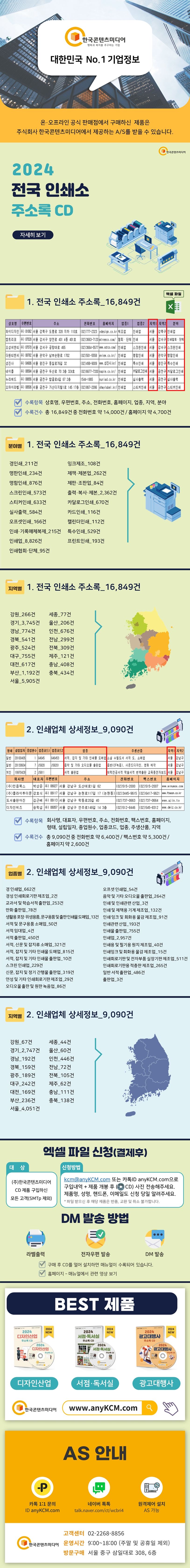 1.전국인쇄소주소록_16,849건수록항목:상호명,우편번호,주소,전화번호,홈페이지,업종,지역,분야수록건수:총16,849건중전화번호약14,000건/홈페이지약4,700건●분야별①경인쇄_211건②명판인쇄_234건③명함인쇄_876건④스크린인쇄_573건⑤스티커인쇄_633건⑥실사출력_584건⑦오프셋인쇄_166건⑧인쇄·기록매체복제_215건⑨인쇄업_8,826건⑩인쇄협회·단체_95건⑪잉크제조_108건⑫제책·제본업_262건⑬제판·조판업_84건⑭출력·복사·제본_2,362건⑮카달로그인쇄_670건⑯카드인쇄_116건⑰캘린더인쇄_112건⑱특수인쇄_529건⑲프린트인쇄_193건●지역별①강원_266건②경기_3,745건③경남_774건④경북_541건⑤광주_524건⑥대구_755건⑦대전_617건⑧부산_1,192건⑨서울_5,905건⑩세종_77건⑪울산_206건⑫인천_676건⑬전남_299건⑭전북_309건⑮제주_121건⑯충남_408건⑰충북_434건2.인쇄업체상세정보_9,090건수록항목:회사명,대표자,우편번호,주소,전화번호,팩스번호,홈페이지,형태,설립일자,종업원수,업종코드,업종,주생산품,지역수록건수:총9,090건중전화번호약6,400건/팩스번호약5,300건/홈페이지약2,600건●업종별①경인쇄업_662건②경성인쇄회로기판제조업_2건③교과서및학습서적출판업_253건④만화출판업_78건⑤생활용포장·위생용품,문구용품및출판인쇄물도매업_13건⑥서적및문구용품소매업_50건⑦서적임대업_4건⑧서적출판업_450건⑨서적,신문및잡지류소매업_321건⑩서적,잡지및기타인쇄물도매업_815건⑪서적,잡지및기타인쇄물출판업_10건⑫스크린인쇄업_229건⑬신문,잡지및정기간행물출판업_319건⑭연성및기타인쇄회로기판제조업_29건⑮오디오물출판및원판녹음업_86건⑯오프셋인쇄업_54건⑰음악및기타오디오물출판업_264건⑱인쇄및인쇄관련산업_3건⑲인쇄및제책용기계제조업_132건⑳인쇄잉크및회화용물감제조업_91건㉑인쇄관련산업_193건㉒인쇄물출판업_755건㉓인쇄업_2,957건㉔인쇄용및필기용원지제조업_40건㉕인쇄잉크및회화용물감제조업_15건㉖인쇄회로기판및전자부품실장기판제조업_511건㉗인쇄회로기판용적층판제조업_265건㉘일반서적출판업_486건㉙출판업_3건●지역별①강원_67건②경기_2,747건③경남_192건④경북_159건⑤광주_189건⑥대구_242건⑦대전_169건⑧부산_236건⑨서울_4,051건⑩세종_44건⑪울산_60건⑫인천_446건⑬전남_72건⑭전북_105건⑮제주_62건⑯충남_111건⑰충북_138건