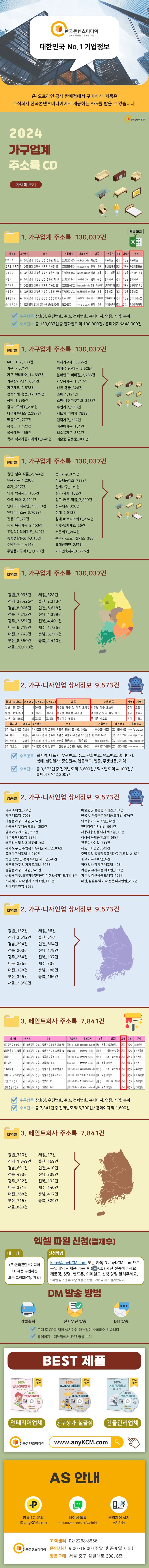 가구업계 주소록을 분야별, 지역별로 130,037건, 가구·디자인업 상세정보를 업종별, 지역별로 9,573건, 페인트회사 주소록을 지역별로 7,841건을 수록했습니다.