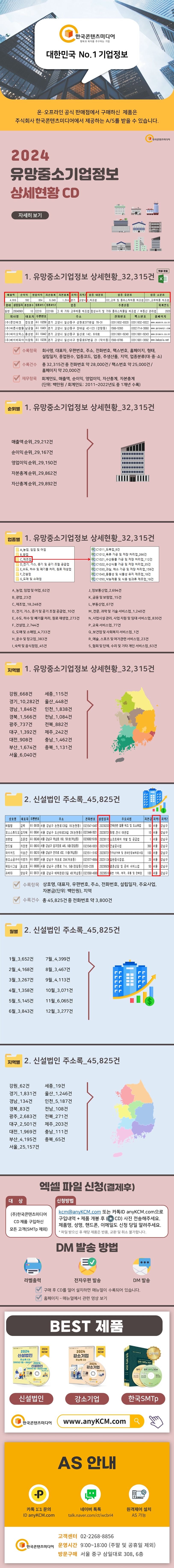 수록항목:회사명,대표자,우편번호,주소,전화번호,팩스번호,홈페이지,형태,설립일자,종업원수,업종코드,업종,주생산품,지역,업종분류(대·중·소)