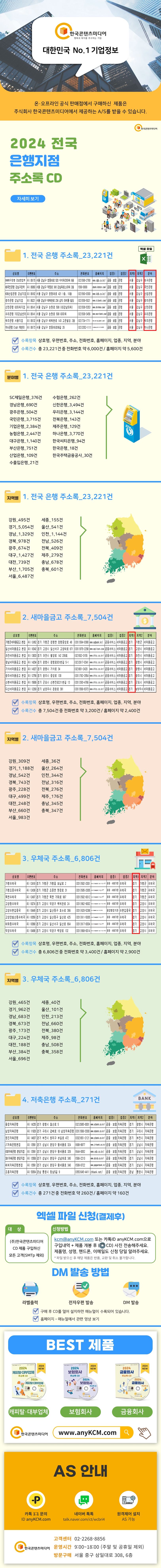 1.전국은행주소록_23,221건수록항목:상호명,우편번호,주소,전화번호,홈페이지,업종,지역,분야수록건수:총23,221건중전화번호약6,000건/홈페이지약5,600건●분야별①SC제일은행_376건②경남은행_690건③광주은행_504건④국민은행_3,715건⑤기업은행_2,384건⑥농협은행_2,447건⑦대구은행_1,140건⑧부산은행_751건⑨산업은행_109건⑩수출입은행_21건⑪수협은행_262건⑫신한은행_3,494건⑬우리은행_3,144건⑭전북은행_143건⑮제주은행_129건⑯하나은행_3,770건⑰한국씨티은행_94건⑱한국은행_18건⑲한국주택금융공사_30건●지역별①강원_495건②경기_5,054건③경남_1,329건④경북_978건⑤광주_674건⑥대구_1,427건⑦대전_739건⑧부산_1,705건⑨서울_6,487건⑩세종_155건⑪울산_541건⑫인천_1,144건⑬전남_526건⑭전북_409건⑮제주_279건⑯충남_678건⑰충북_601건2.새마을금고주소록_7,504건수록항목:상호명,우편번호,주소,전화번호,홈페이지,업종,지역,분야수록건수:총7,504건중전화번호약3,200건/홈페이지약2,400건●지역별①강원_309건②경기_1,188건③경남_542건④경북_743건⑤광주_228건⑥대구_499건⑦대전_248건⑧부산_660건⑨서울_983건⑩세종_36건⑪울산_264건⑫인천_344건⑬전남_316건⑭전북_276건⑮제주_176건⑯충남_345건⑰충북_347건3.우체국주소록_6,806건수록항목:상호명,우편번호,주소,전화번호,홈페이지,업종,지역,분야수록건수:총6,806건중전화번호약3,400건/홈페이지약2,900건●지역별①강원_465건②경기_962건③경남_683건④경북_673건⑤광주_173건⑥대구_224건⑦대전_188건⑧부산_384건⑨서울_696건⑩세종_40건⑪울산_101건⑫인천_213건⑬전남_660건⑭전북_380건⑮제주_98건⑯충남_508건⑰충북_358건4.저축은행주소록_271건수록항목:상호명,우편번호,주소,전화번호,홈페이지,업종,지역,분야수록건수:총271건중전화번호약260건/홈페이지약160건