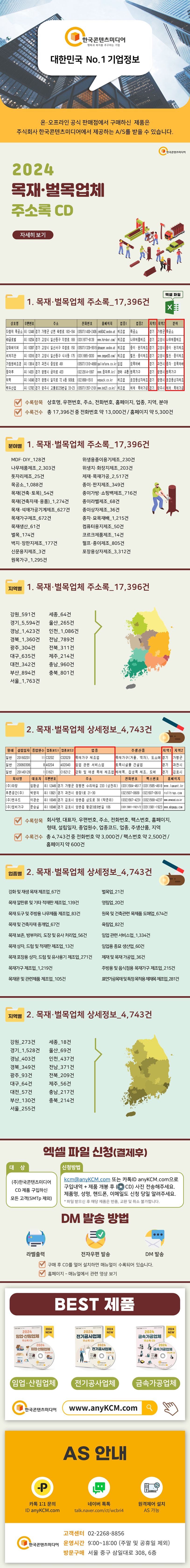 1.목재·벌목업체주소록_17,396건수록항목:상호명,우편번호,주소,전화번호,홈페이지,업종,지역,분야수록건수:총17,396건중전화번호약13,000건/홈페이지약5,300건●분야별①MDF·DIY_128건②나무제품제조_2,303건③돗자리제조_25건④목공소_1,088건⑤목재(건축·토목)_54건⑥목재(건축자재·용품)_1,274건⑦목재·석재가공기계제조_627건⑧목재가구제조_672건⑨목재생산_61건⑩벌목_174건⑪벽지·장판지제조_177건⑫신문용지제조_3건⑬원목가구_1,295건⑭위생용종이용기제조_230건⑮위생지·화장지제조_203건⑯제재·목재가공_2,517건⑰종이·판지제조_349건⑱종이가방·쇼핑백제조_716건⑲종이라벨제조_68건⑳종이상자제조_36건㉑종자·묘목재배_1,215건㉒컴퓨터용지제조_50건㉓코르크제품제조_14건㉔펄프·종이제조_805건㉕포장용상자제조_3,312건●지역별①강원_591건②경기_5,594건③경남_1,423건④경북_1,360건⑤광주_304건⑥대구_635건⑦대전_342건⑧부산_894건⑨서울_1,763건⑩세종_64건⑪울산_265건⑫인천_1,086건⑬전남_789건⑭전북_311건⑮제주_214건⑯충남_960건⑰충북_801건2.목재·벌목업체상세정보_4,743건수록항목:회사명,대표자,우편번호,주소,전화번호,팩스번호,홈페이지,형태,설립일자,종업원수,업종코드,업종,주생산품,지역수록건수:총4,743건중전화번호약3,000건/팩스번호약2,500건/홈페이지약600건●업종별①강화및재생목재제조업_67건②목재깔판류및기타적재판제조업_139건③목재도구및주방용나무제품제조업_83건④목재및건축자재중개업_67건⑤목재보존,방부처리,도장및유사처리업_56건⑥목재상자,드럼및적재판제조업_13건⑦목재포장용상자,드럼및유사용기제조업_271건⑧목재가구제조업_1,219건⑨목재문및관련제품제조업_105건⑩벌목업_21건⑪영림업_20건⑫원목및건축관련목제품도매업_674건⑬육림업_82건⑭임업관련서비스업_1,334건⑮임업용종묘생산업_60건⑯제재및목재가공업_36건⑰주방용및음식점용목재가구제조업_215건⑱표면가공목재및특정목적용제재목제조업_281건●지역별①강원_273건②경기_1,528건③경남_403건④경북_349건⑤광주_93건⑥대구_64건⑦대전_57건⑧부산_130건⑨서울_255건⑩세종_18건⑪울산_69건⑫인천_437건⑬전남_371건⑭전북_209건⑮제주_56건⑯충남_217건⑰충북_214건