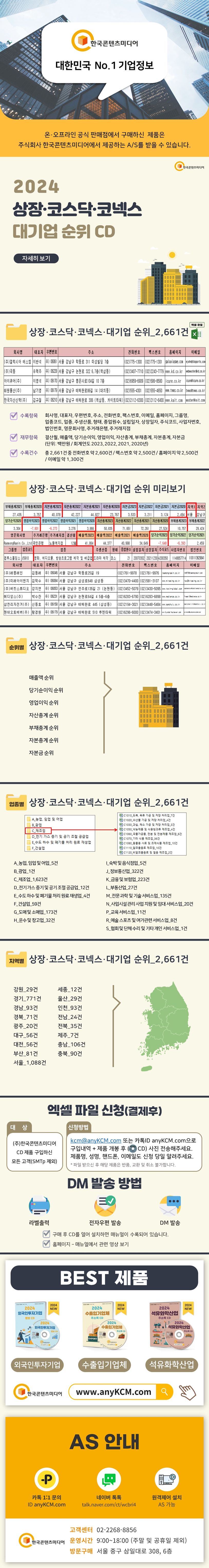 ▶〈2024상장·코스닥·코넥스대기업순위CD〉란?상장·코스닥·코넥스대기업순위를순위별,업종별,지역별로2,661건을수록했습니다.▶〈2024상장·코스닥·코넥스대기업순위CD〉특징은?1.주식회사한국콘텐츠미디어는1999년설립해매년300종의업종별주소록,기업정보데이터베이스를출시하고있어제품의품질및AS를보증합니다.2.엑셀파일을자유롭게수정·편집·출력할수있습니다.3.순위별,업종별,지역별로상세하게분류했습니다.4.자료의정확성을위해최신행정구역을반영했습니다.5.DM발송가이드(엑셀/폼텍/전자우편/우체국/마케팅등)를제공합니다.〈책임의한계와법적고지〉·본제품의저작권및판권은주식회사한국콘텐츠미디어에있으며저작권법및소프트웨어법에의해보호받는라이센스저작물이므로무단복제및무단전재를금합니다.·본제품의자료수집한계로인해그정확도가일부제한됨을알려드립니다.·본제품을활용하여영리성광고정보전송을하는경우정보이용촉진및정보보호등에관한법률제50조에따른준수사항을반드시지켜야하며이를어길경우관련법에따라처벌받을수있습니다.·본제품사용에따른결과및판단은민형사를포함한일체가전적으로사용자(사)에게책임이있습니다.·본제품은전자출판물로서해당법령및실천요강을준수합니다.