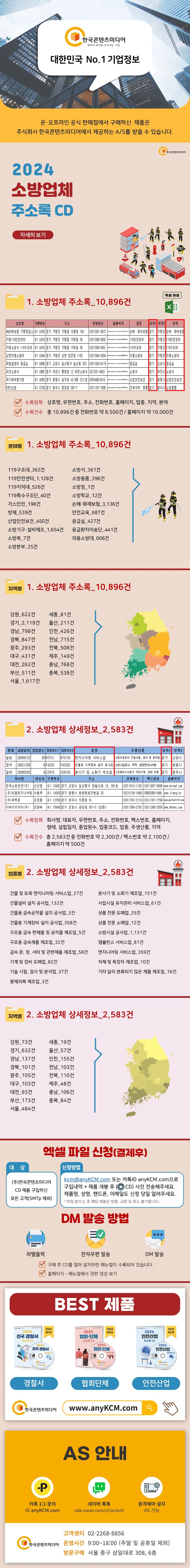 1.소방업체주소록_10,896건수록항목:상호명,우편번호,주소,전화번호,홈페이지,업종,지역,분야수록건수:총10,896건중전화번호약8,500건/홈페이지약10.000건●분야별①119구조대_362건②119안전센터_1,128건③119지역대_526건④119특수구조단_40건⑤가스안전_198건⑥방재_539건⑦산업안전보건_450건⑧소방기구·설비제조_1,654건⑨소방복_7건⑩소방본부_25건⑪소방서_361건⑫소방용품_296건⑬소방청_1건⑭소방학교_12건⑮손해·화재보험_3,136건⑯안전교육_687건⑰응급실_427건⑱응급환자이송단_441건⑲의용소방대_606건●지역별①강원_622건②경기_2,119건③경남_798건④경북_847건⑤광주_293건⑥대구_431건⑦대전_262건⑧부산_511건⑨서울_1,617건⑩세종_81건⑪울산_211건⑫인천_426건⑬전남_715건⑭전북_508건⑮제주_149건⑯충남_768건⑰충북_538건2.소방업체상세정보_2,583건수록항목:회사명,대표자,우편번호,주소,전화번호,팩스번호,홈페이지,형태,설립일자,종업원수,업종코드,업종,주생산품,지역수록건수:총2,583건중전화번호약2,300건/팩스번호약2,100건/홈페이지약500건●업종별①건물및토목엔지니어링서비스업_27건②건물설비설치공사업_132건③건물용금속공작물설치공사업_3건④건물용기계장비설치공사업_358건⑤구조용금속판제품및공작물제조업_5건⑥구조용금속제품제조업_32건⑦금속문,창,셔터및관련제품제조업_58건⑧기계및장비도매업_82건⑨기술시험,검사및분석업_37건⑩봉제의복제조업_3건⑪분사기및소화기제조업_151건⑫사업시설유지관리서비스업_61건⑬상품전문도매업_25건⑭상품전문소매업_12건⑮소방시설공사업_1,131건⑯앰뷸런스서비스업_81건⑰엔지니어링서비스업_359건⑱차체및특장차제조업_10건⑲기타달리분류되지않은제품제조업_16건●지역별①강원_73건②경기_632건③경남_137건④경북_101건⑤광주_105건⑥대구_103건⑦대전_93건⑧부산_173건⑨서울_484건⑩세종_19건⑪울산_57건⑫인천_155건⑬전남_103건⑭전북_110건⑮제주_48건⑯충남_106건⑰충북_84건