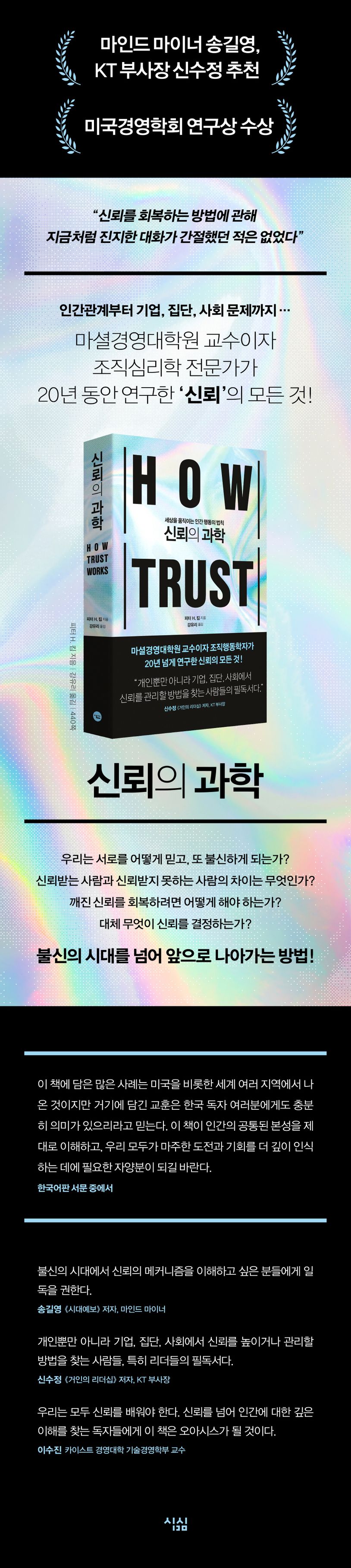 우리가 누군가를 믿거나 믿지 않는 선택은 과연 자의에 의해서 이루어질까? 신뢰는 어떻게 쌓이며, 어떤 방식으로 무너지고, 무엇으로 인해 다시 회복되는 것인가? 신뢰 문제를 둘러싼 신뢰의 메커니즘을 담은 책, 《신뢰의 과학(원제: How Trust Works: The Science of How Relationships are Built, Broken, and Repaired, 심심刊)》이 출간되었다.