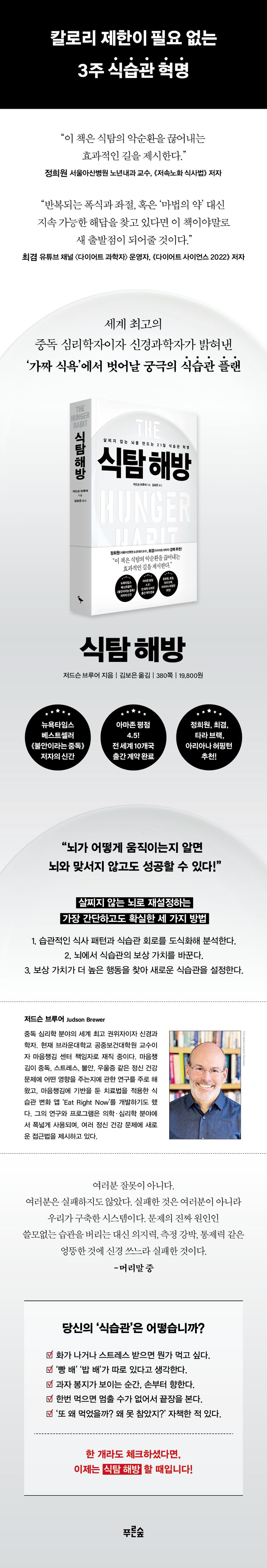 “식탐의 악순환을 끊어내는 효과적인 길을 제시”하는 《식탐 해방》이 도서출판 푸른숲에서 출간되었다. 세계 최고의 중독 심리학자이자 신경과학자인 저드슨 브루어 박사는 이 책에서 ‘식탐’이 정서적 허기에서 비롯된 중독적인 ‘습관’이라고 단언한다. 저자는 최신 뇌과학·신경과학·심리학적 이론과 풍부한 임상 사례를 통해 ‘식탐 습관’을 끊으려면 우리 뇌가 움직이는 작동법과 식습관 패턴을 이해하고, 몸이 보내는 신호에 귀 기울일 줄 알아야 한다고 명쾌하게 진단한다. 나아가 ‘먹지 않겠다’는 의지에 의존하는 단기적이고 지속 불가한 기존의 다이어트법 대신 실용적인 마음챙김에 기반한 근본적이고 지속 가능한 여러 전략을 ‘21일 도전’ 프로그램을 통해 알려준다. 이로써 우리는 해로운 습관을 끊는 데서 그치지 않고 보다 건강한 습관을 시작하는 길을 발견할 수 있다.