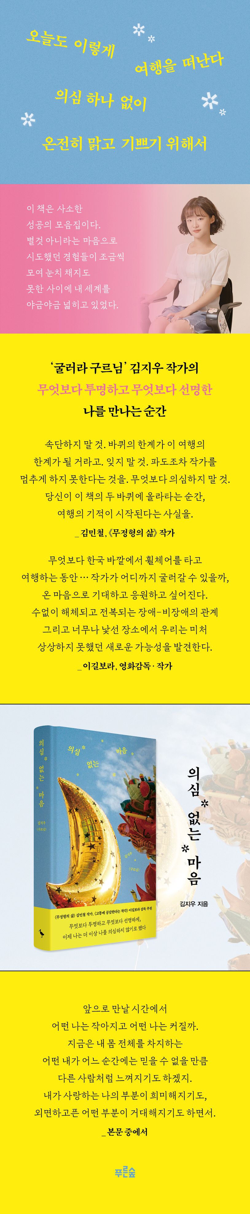 이 책은 휠체어를 타는 장애인도 성공하는 것을 증명하겠다는 야심만만한 여행기가 아니다. 《하고 싶은 말이 많고요, 구릅니다》, 《우리의 활보는 사치가 아니야》를 출간한 ‘굴러라 구르님’ 김지우 작가는 자신의 유튜브 채널에 8년 전부터 여행 영상을 꾸준히 올려왔다. 총 27개의 영상 속에서 그는 가족들과 일본 여행을 하고 아빠와 대만, 마카오, 홍콩을 거쳐 친구들과 함께 프랑스 그리고 스위스로, 엄마와의 독일 여행을 지나 6주간의 홀로 호주 여행에까지 이른다. 스무 살 처음 지하철을 탔을 때의 설렘처럼, 그는 일상과는 전혀 다른 여행지에서 울고 웃고 포옹하고 춤추고 기차를 놓치고 싸우며 당연하게 여기던 것들을 새로이 감각했다. 이 여행의 끝에 남은 것은 기념품도, 여행지의 사진도 아닌 무엇보다 선명하고 무엇보다 투명한 ‘나 자신’이다.