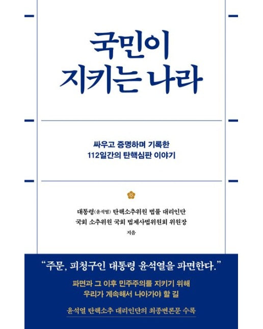 푸른숲에서 출간된 《국민이 지키는 나라》는 윤석열 탄핵심판 과정을 담은 책으로, 헌법재판소 심판정에서 피청구인 윤석열과 맞서며 탄핵을 이끌어낸 이들의 목소리를 담았다. 12·3 비상계엄 선포 당일부터 2025년 4월 4일 파면 선고 순간까지 112일간의 탄핵심판 과정에서 대통령(윤석열) 탄핵소추위원 법률 대리인단 17인과 정청래 국회 소추위원·국회 법제사법위원회 위원장은 그간의 과정과 감정을 직접 솔직하게 풀어낸다. 혼란하고 급박한 시국에 대리인단에 합류하게 되었을 때의 심정, 심판정에서 피의자를 마주하고 느꼈던 분노, 함께한 동료와의 끈끈한 동지애, 그리고 누구보다 앞장서서 헌법을 수호한 국민에 대한 경애심까지, 그동안 어디서도 자세하게 들어볼 수 없었던 소회를 담고 있다.