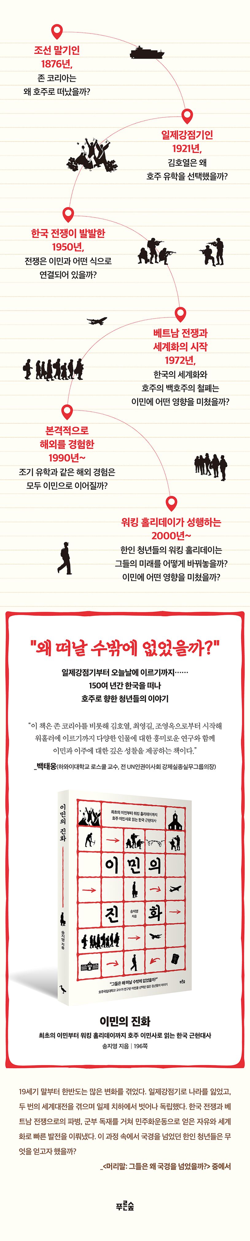 이민 연구에 있어 핵심은 바로 ‘배출 요인’과 ‘유입 요인’이다. 배출 요인은 왜 국가를 떠날 수밖에 없는지, 자의 혹은 타의로 떠나게 만드는 부정적 요인을 말한다. 전쟁이 한창이던 시절에는 가난과 식량 문제가 가장 큰 배출 요인이고, 지금은 차별, 경제적 한계, 교육 등이 주된 배출 요인이다. 유입 요인은 해당 국가로 유입하게 되는 긍정적 요소를 뜻한다. 근로 조건, 비전, 거주 및 자연 환경 등이 포함된다. 흥미로운 것은 시대적 상황에 따라 청년들이 느끼는 배출 요인과 유입 요인은 달라진다는 점이다. 따라서《이민의 진화》는 호주 이민의 역사를 최초로 정리한 의미 있는 작업일 뿐 아니라, 이를 통해 굴곡과 사연이 깊은 우리나라의 근현대사를 종으로 꿰뚫어 볼 수 있는 무척이나 흥미로운 기록이다.