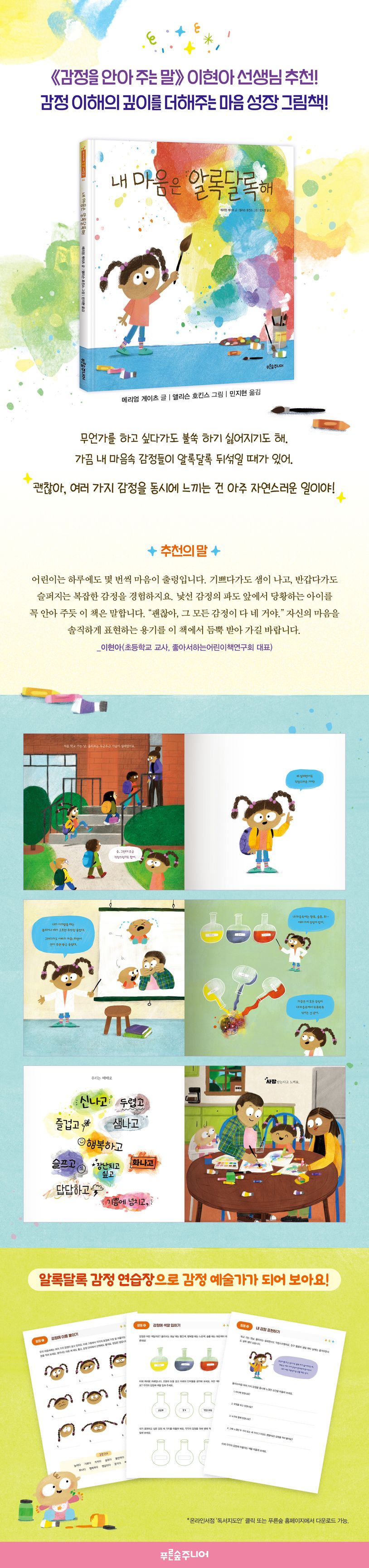 이 책은 하루에도 몇 번씩 마음이 왔다 갔다 하는 아이들에게 “누구나 여러 가지 감정을 동시에 느끼며, 반드시 하나의 감정만을 느끼고 표현해야 하는 것은 아니”라고 말해줍니다. 《내 마음은 알록달록해》는 학교, 집, 가족관계, 친구 사이 등 일상에서 아이가 흔히 겪을 수 있는 여러 상황을 생생하게 보여줌으로써 여러 가지 감정을 동시에 느끼는 건 아주 ‘자연스러운 일’이라는 것을 아이 스스로 받아들이도록 도와줍니다.