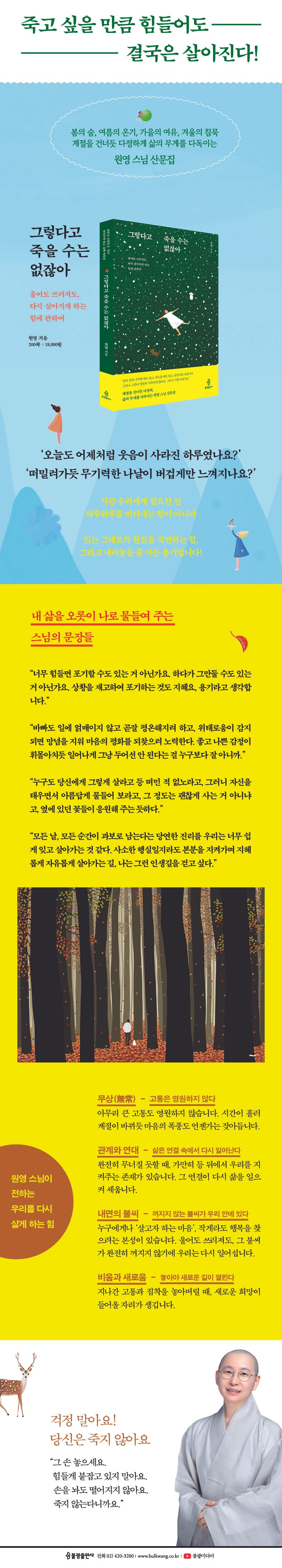 《그렇다고 죽을 수는 없잖아》는 매 순간 버티듯 살아가는 현대인들에게 전하는 원영 스님의 위로와 응원의 메시지다. 때로 지치고 힘들고 괴로워도, 끝내 삶은 살아진다는 희망을 들려준다. 현실을 직면함으로써 얻을 수 있는 삶을 향한 깊은 긍정, 나와 마주 앉을 용기를 건네는 문장들이 잔잔하게 그러나 단단하게 이어진다.