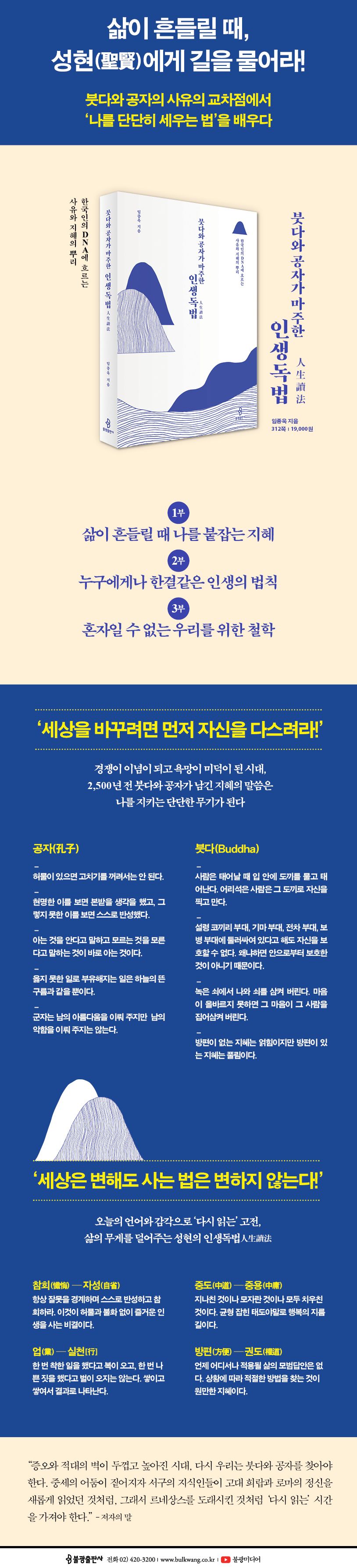 불안과 분열이 일상이 된 지금, ‘흔들리지 않는 마음의 힘’은 현대인이 지녀야 할 필수 덕목이 되었다. 무엇으로부터 그 힘을 길러 낼 것인가? 『붓다와 공자가 마주한 인생독법』은 붓다와 공자라는, 한국인의 DNA에 흐르는 사유와 지혜의 뿌리에서 답을 찾는다. 붓다와 공자의 가르침 가운데서 공통분모를 찾아내 그 안에 담긴 유구한 삶의 지혜를 보여준다. 이 책은 ‘이 말은 이런 뜻이고 저 말은 저런 뜻이다’ 하고 붓다와 공자의 말을 되풀이하는 단순한 고전 해설서가 아니다. 저자가 반백 년 삶을 통과하며 길어 올린 ‘살아 있는 지혜의 알곡’이다. 세상 앞에 당당해지는 법, 적(敵)이 아닌 벗을 만드는 법, 목표한 바를 이루는 법, 소중한 이 삶을 누리는 법 등 2,500년 전 붓다와 공자가 전한 통찰을 오늘날의 감각으로 새롭게 들려준다. 서둘러 가기보다 오래 멀리 가고, 뜻하는 대로 후회 없이 가는 인생길을 안내한다.