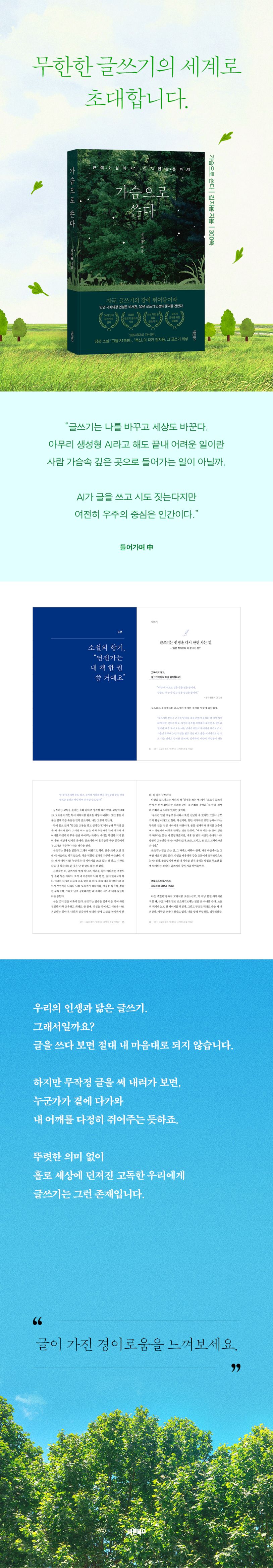 “가슴의 글쓰기란, 뉴질랜드의 장엄한 설산 앞에서 내 실존의 무한성에 주르륵 흘러내리는 눈물 같은 글쓰기다.” ‘386세대의 자서전’이라는 세평을 받았던 장편소설 『그들 81학번』과 그 연작 『독신』의 작가 김지용이 30년 글쓰기 인생의 품격을 전한다. 글쓰기는 인생을 다시 한번 사는 확실한 길이다. 소설, 수필, 자서전, SNS 글쓰기까지 글쓰기의 무한 세계를 정연하게 안내한다. 또한 저자의 오랜 지병이던 ‘주요 우울증’을 극복하는 ‘치유의 글쓰기’, ‘가슴의 글쓰기’로 지금도 악몽 속에 신음하는 세상의 수많은 전사들의 아픔과 함께하고 봉사하고 싶다. 앞으로 양평과 같은 한적한 교외에서 함박눈 내리는 큰 창밖 눈송이를 바라보며 하염없이 글 쓰며 사는 가슴 벅찬 소망을 품어오고 있다.